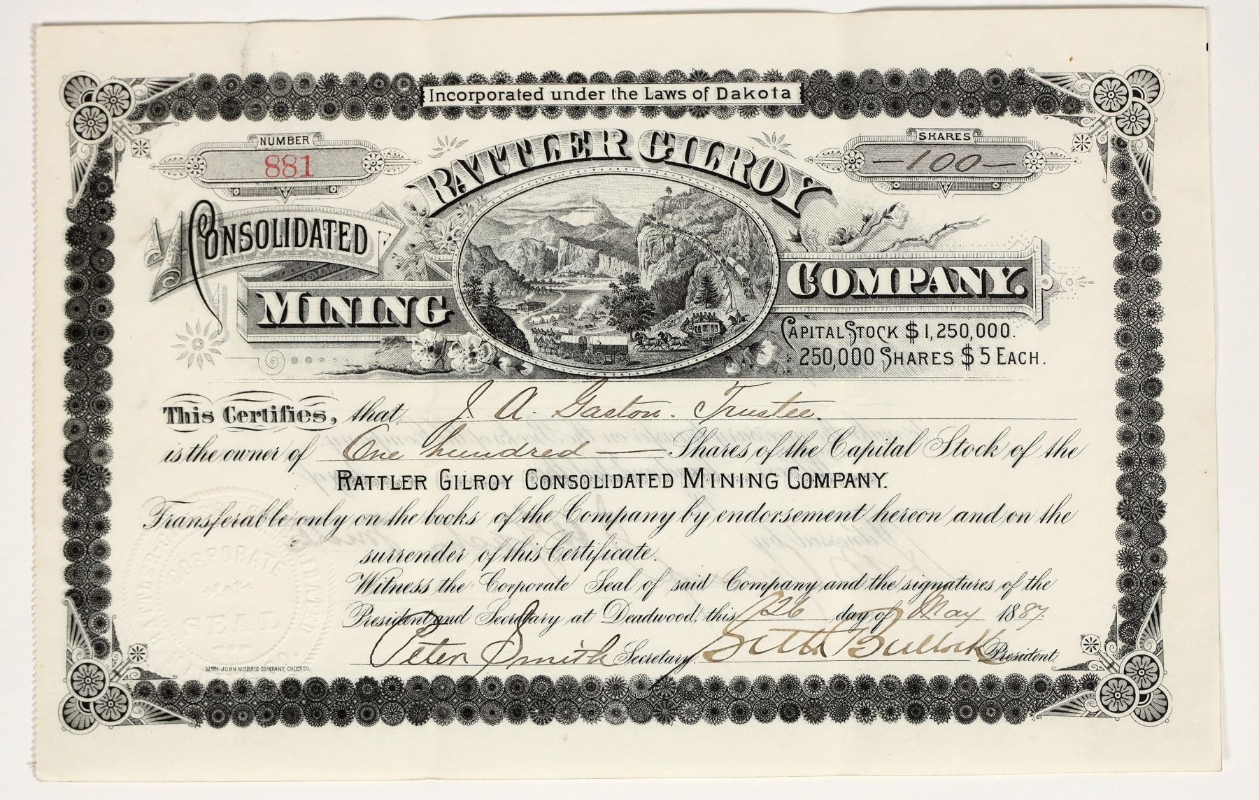 Very rare. Located in the Carbonate Mining District, Lawrence County. Inc. in Dakota. No. 881, issued for 100 shares to JA Gaston in 1887 in Deadwood. Signed by Seth Bullock as president and Peter Smith as secretary. Not cancelled! Black border and print, with great vignette of wagon train coming down from the mountains (makes you think of the Deadwood Stage). Pinhole, folds, clean. 6.5 x 9.75" Seth Bullock was the first sheriff of Deadwood and ran a hardware store there with business partner Sol Star. Coming from law enforcement in Montana, he arrived in Deadwood the day before Wild Bill Hickok was shot and killed. Bullock became close friends with Teddy Roosevelt, and later became US Marshal for South Dakota.