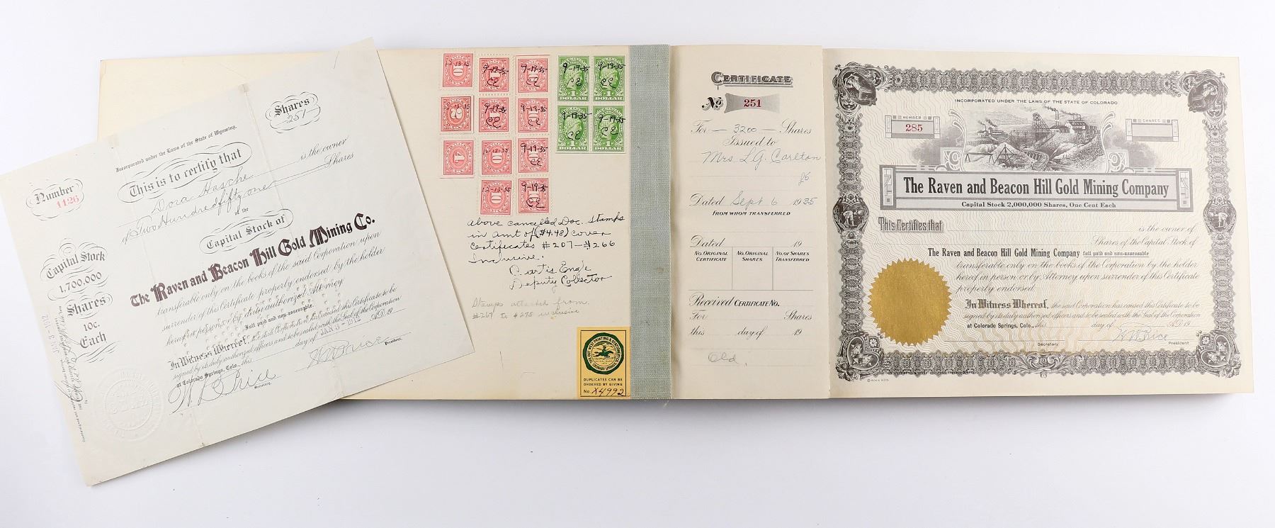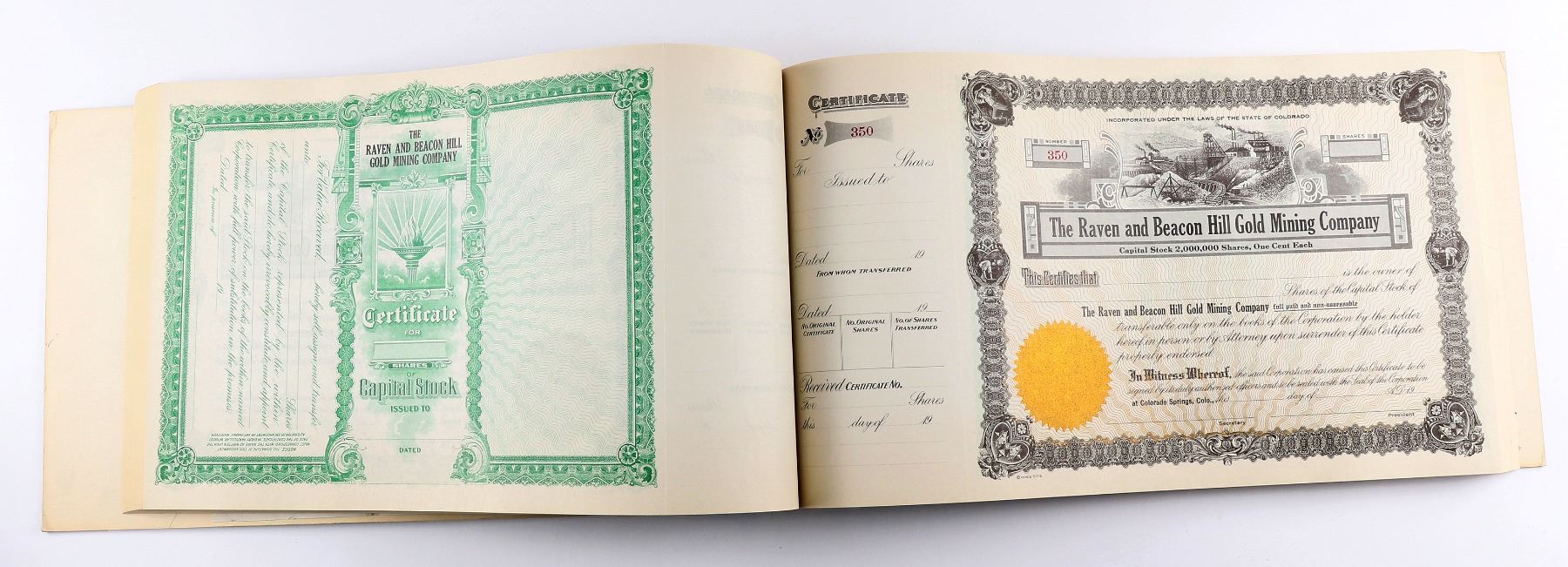 About 185 Raven and Beacon Hill Gold Mining stocks in original book, c. 1900's. Nice mine vignette, 15 tax stamps inside front board. Cripple Creek Colorado