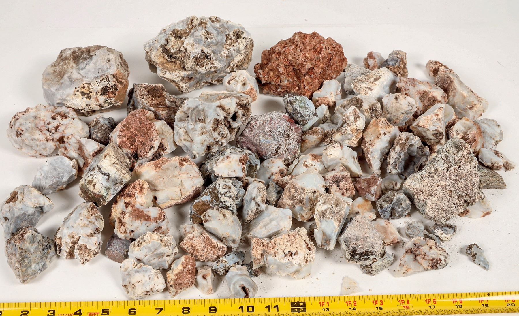 Raw Blue Chalcedony Semi Precious Gemstone. About 15 lbs. of raw, light blue, semi-precious chalcedony from Washoe County, Nevada, a new discovery site. There are some beautiful, polished blue chalcedony cabochons in this sale and this is rough. There are probably 40 specimens in this lot, all raw, not handpicked. (not cherry picked). We cannot say for sure if any of these would make gemstones or not but FH guesses YES!
