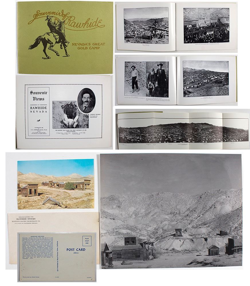 Lot of 4. 1) Souvenir Views of Rawhide: Ned Johnson's photographs. Great photographs: city, mines, people, buildings etc. First tent, first hotel (tent), Tex Rickard's famous drill, EARLY photographs of the town, first saloon (again a tent), Royal Tiger Mine, First Bank of Rawhide, Last Chance Mine, Grutt Hill Lease , etc. Before the great Rawhide fire. 2) Three other pieces: 8x10 photograph of early Rawhide ghost town status, early Rawhide ghost town postcard clearly showing the Wonder Lumber Company, and unused Rawhide Stocks cover. HWAC# 42101 Date: Location: Rawhide, Nevada
