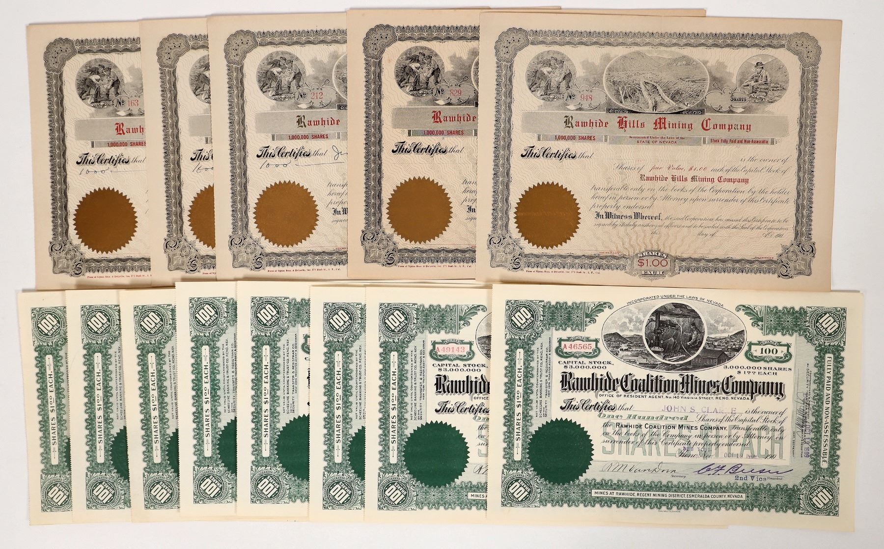 Issued-8x 1909-10 Rawhide Coalition Mines. 5x unissued Rawhide Hills MC.