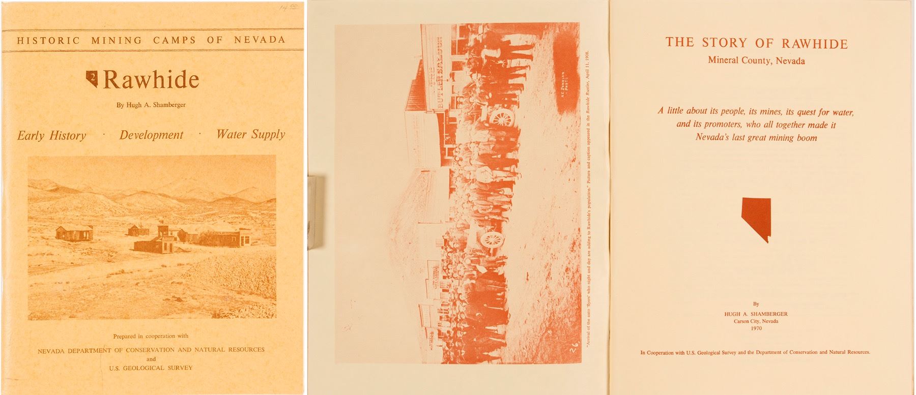 Historic Mining Camps of Nevada, Rawhide by Hugh Shamberger. 45 pages, foldout photos and map. Date: Location: Rawhide, Nevada HWAC # 53762