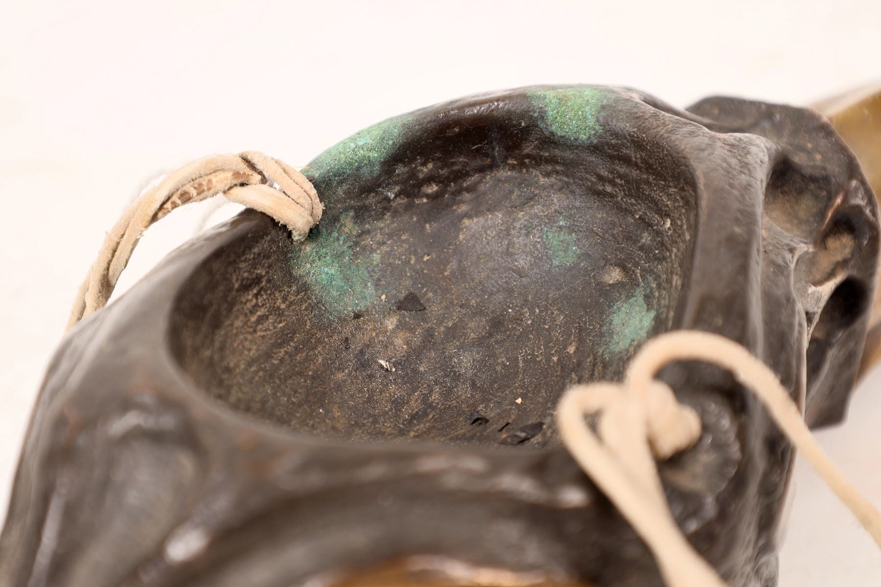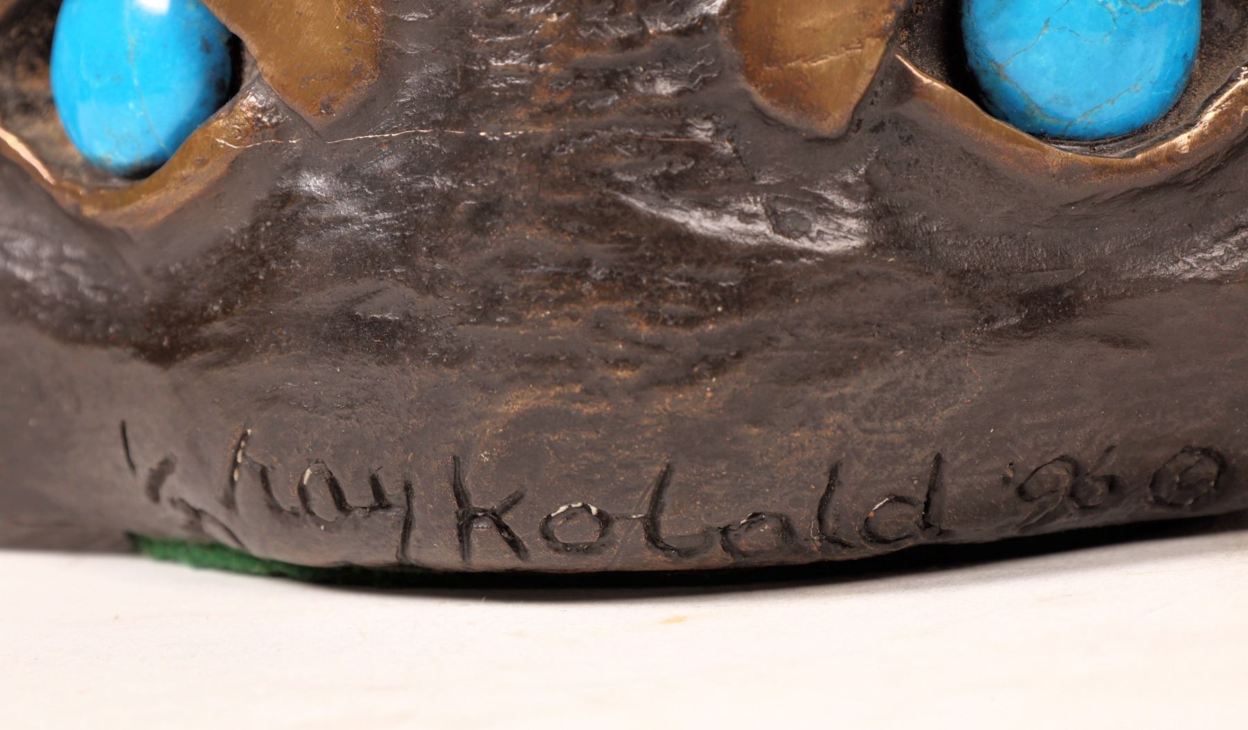 Mexican/American artist signed this double raven sculpted bronze piece with turquois eyes. Piece measures 3"x 12"x 4" and is adorned with sinew ties, beads and cones. A very unique work. Please see photos for more details.