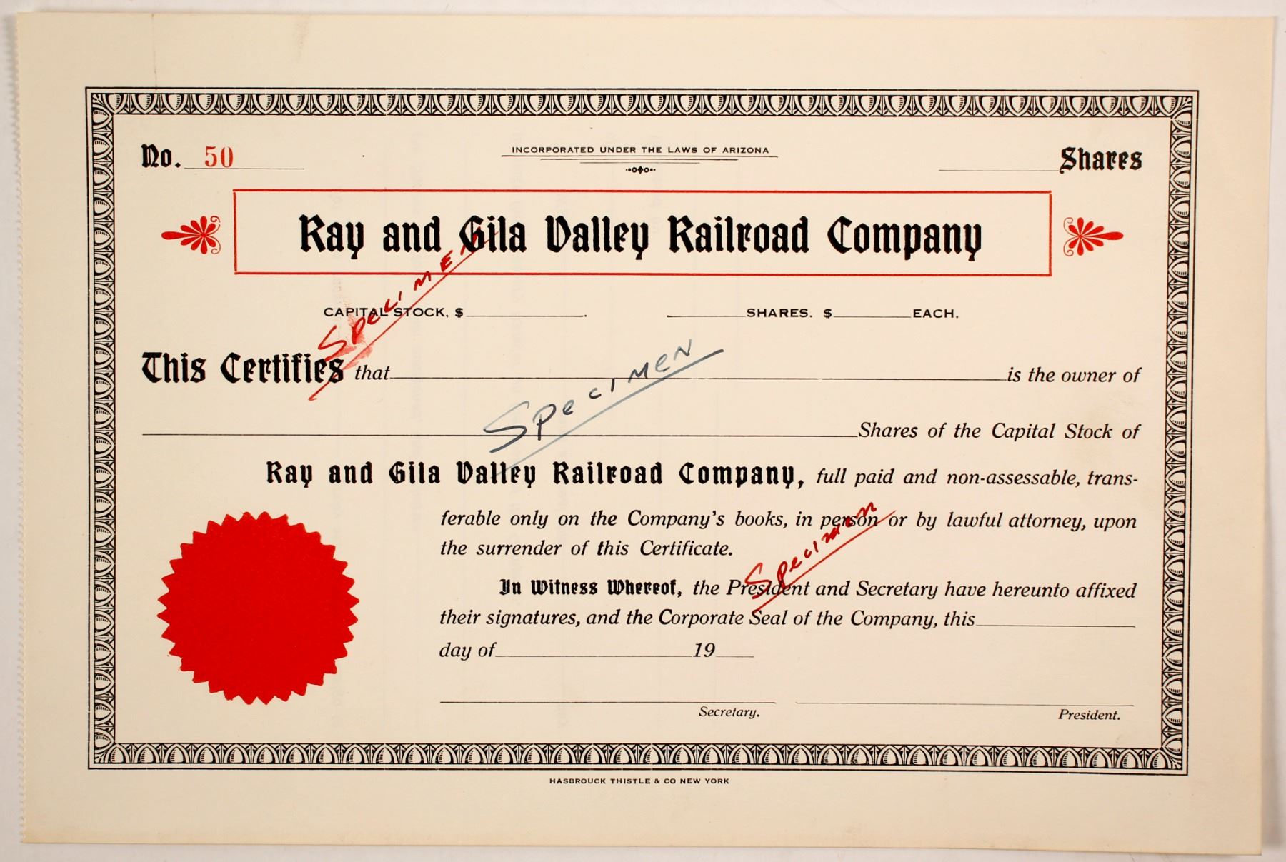 Incorporated State of Arizona. Cert #50 for common stock unk. par value, no details, 19-- printed, , black, specimen handwritten three times, no vignette, Printer: Hasbouck Thistle & Co New York red sea, Cox ref specimen Ken Prag Collection
