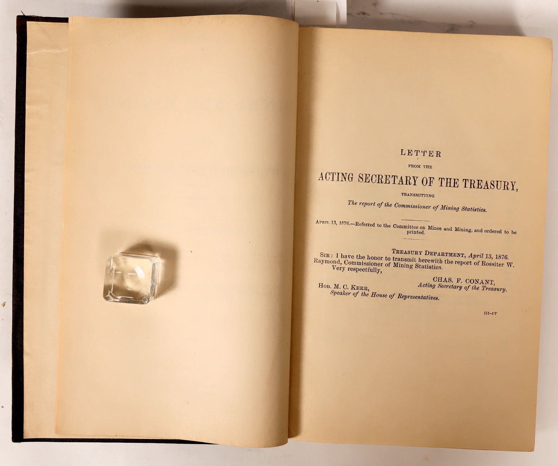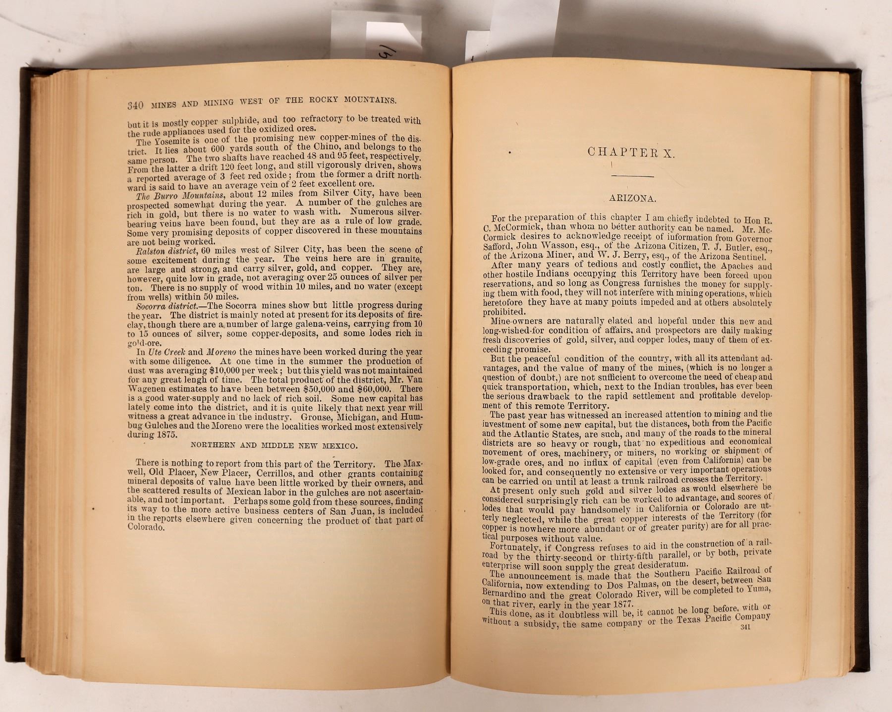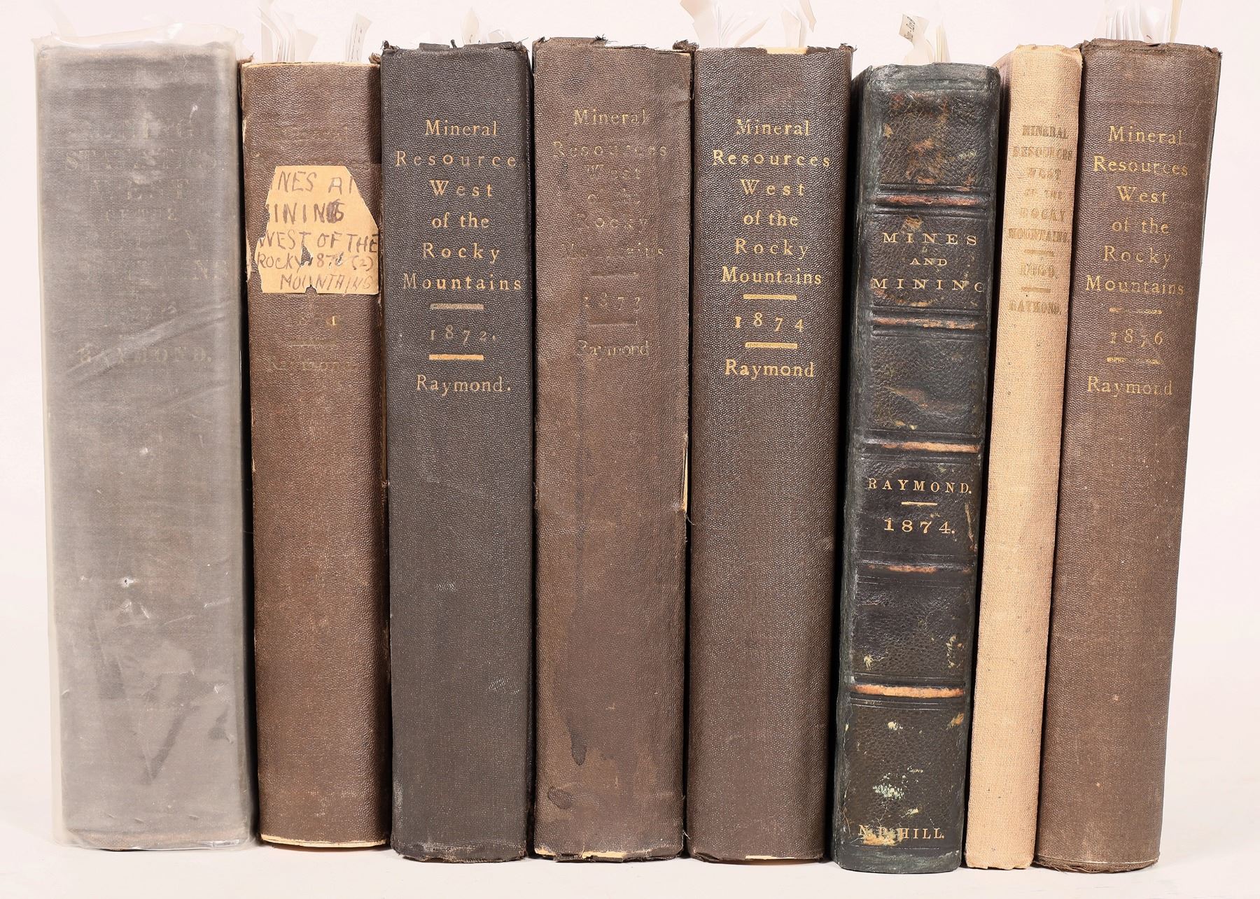 Eight volumes comprising 1869-1876, from the first report of the Mineral Commissioner to the Eighth Report by Ross Raymond. Raymond was a graduate of the Freiberg School of Mines. He followed in the footsteps of J. Ross Browne, who wrote the 1867 and 1868 volumes, found elsewhere in this catalog. Browne was unable to get paid for his work for the federal government , who subsequently let he, and later Raymond, have private publishers print their books under different titles. Both men used New York publishers such as Ford, and others. Book collectors will note that the spines for these volumes are very often, if not most of the time, mismarked with the year on the outside. The key is to look at the title page and ascertain the "first annual report" etc.