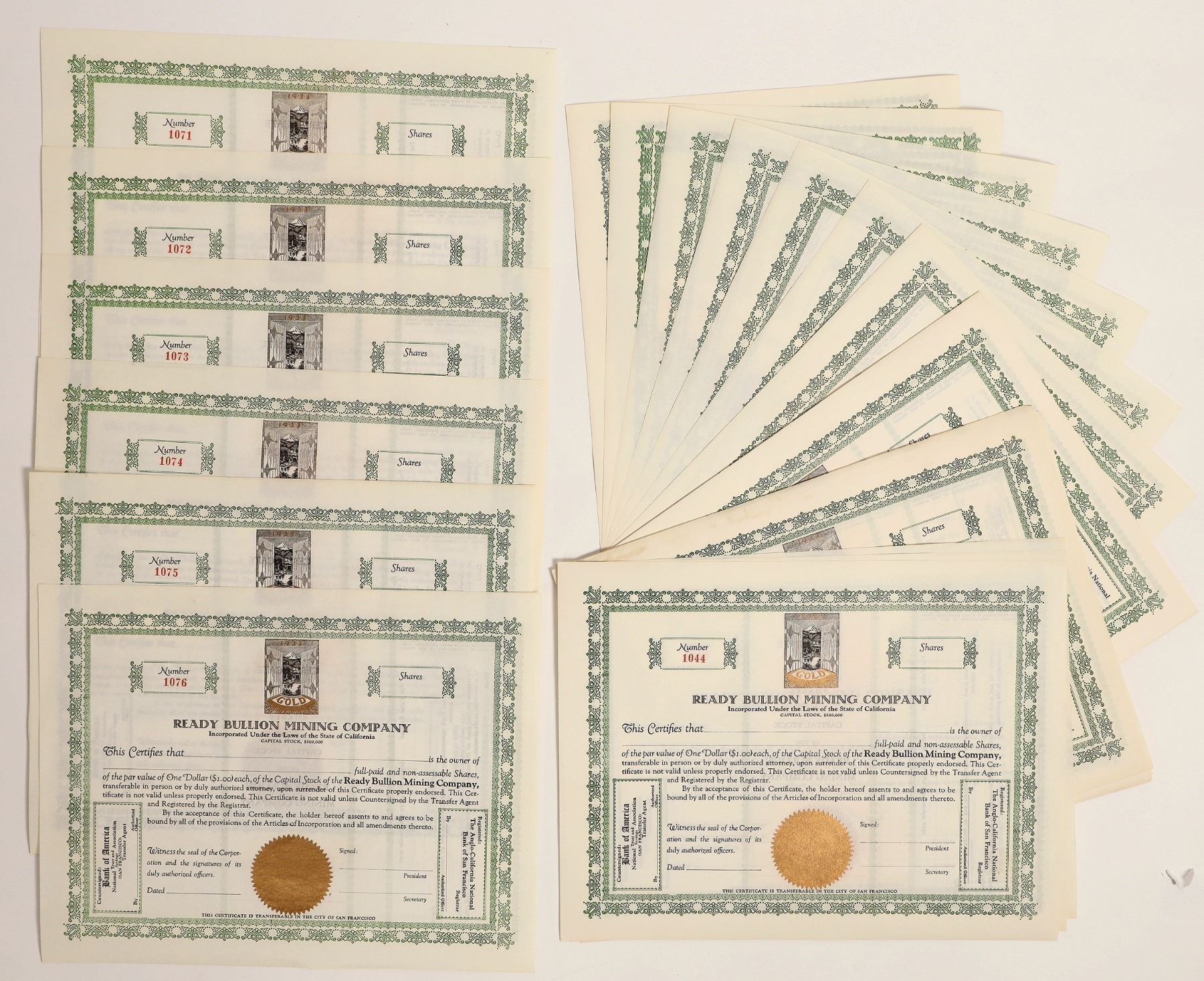About 40 unissued Ready Bullion Mining stocks. Located near Gold Lake, Sierra City Mining District, Sierra County. "Gold" vignette. I love to hike this beautiful area![ California