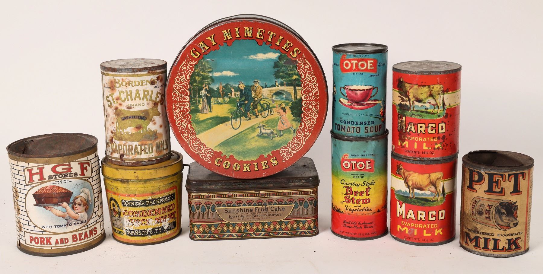 10 ready to eat canned goods, up to 4.75". Pork and beans, cookies, beef stew, mince meat, evaporated milk-label stain, tomato soup, evaporated milk, fruit cake. Gary Bracken Collection