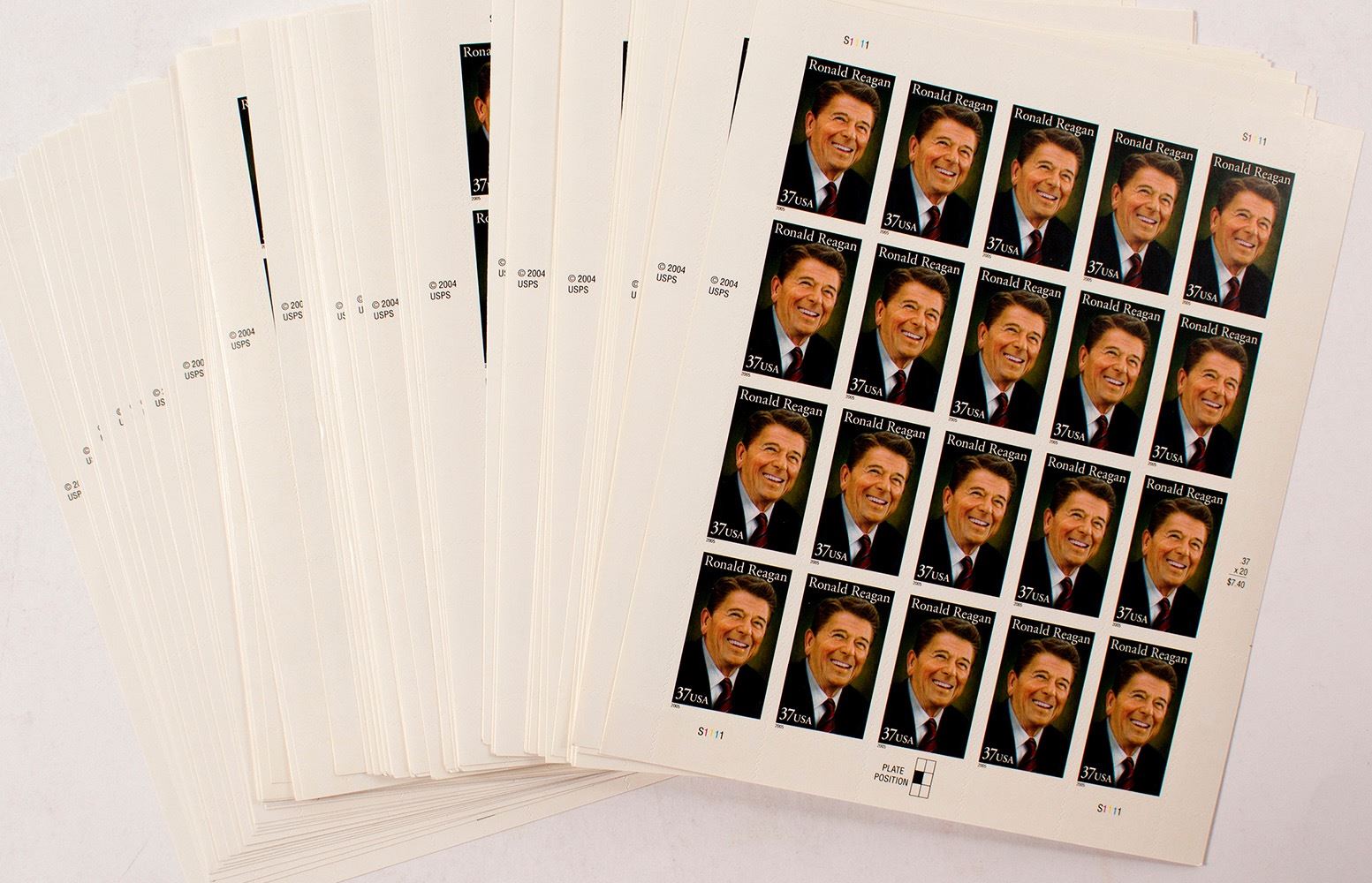 approximately 79 sheets of 20 each of Reagan's Presidential stamp portraits on 37 cent US stamps from 1974. Unused, mint, never touched. Collected in Reagan's home city of Santa Barbara. $710.75 in face value. Date: Location: HWAC# 56443