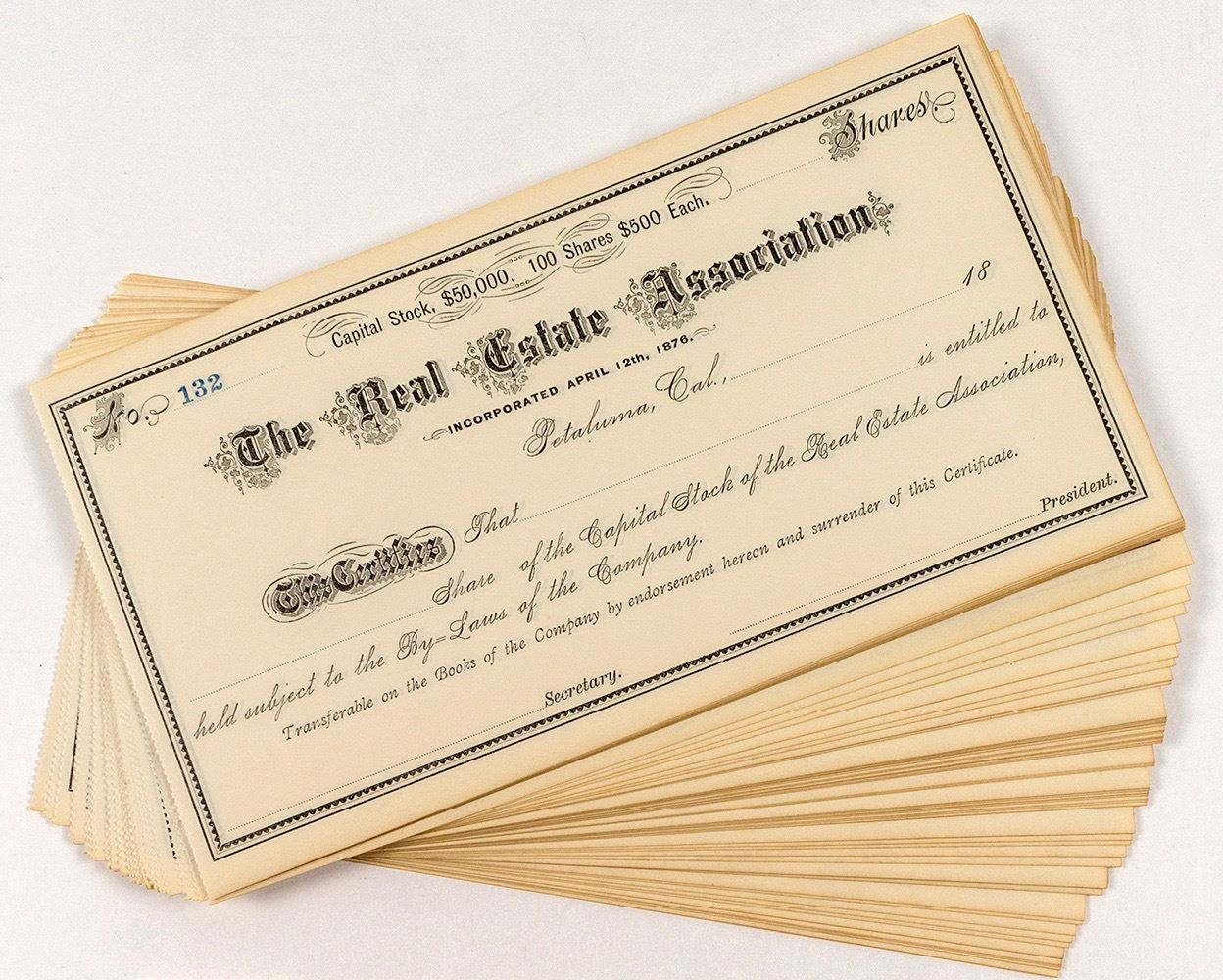 The Real Estate Association certificates, 50 plus unissued, incorporated in 1876 to sell land in the Petaluma country side. City: Petaluma State: California Date: 18xx HWAC # 51902