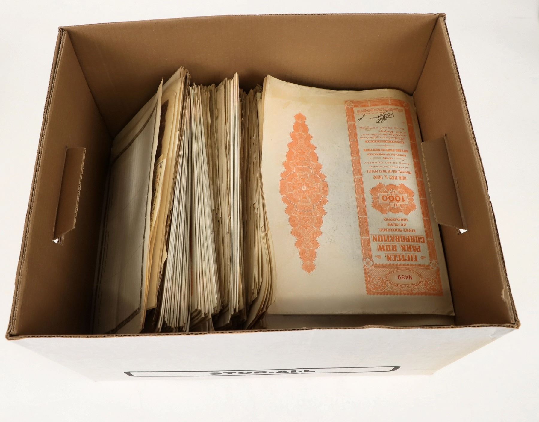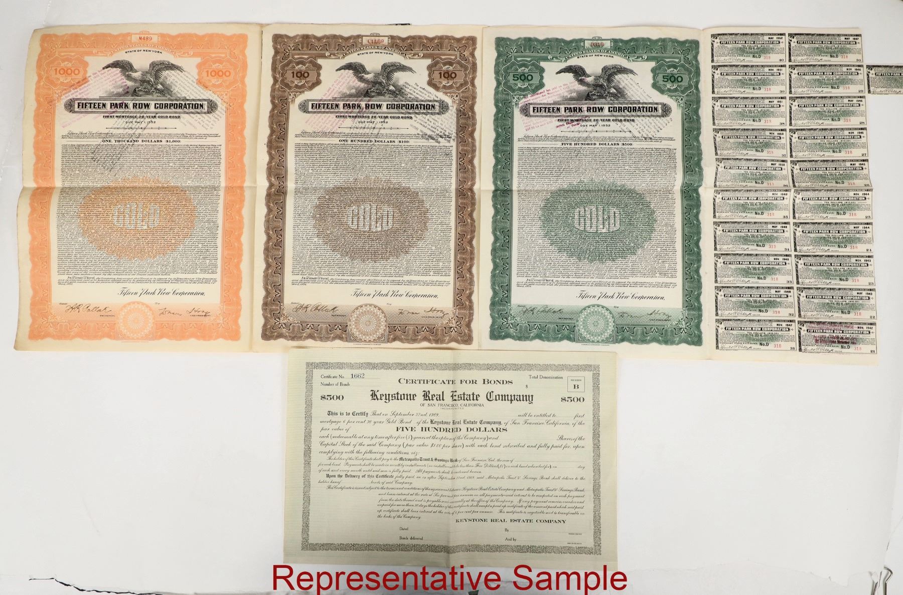 Fifteen Park Row and Keystone; 400-500 Fifteen Park Row 1930s Gold Bonds, orange and brown; Keystone Real Estate, San Francisco, unissued, c.1910 about 60 pieces.