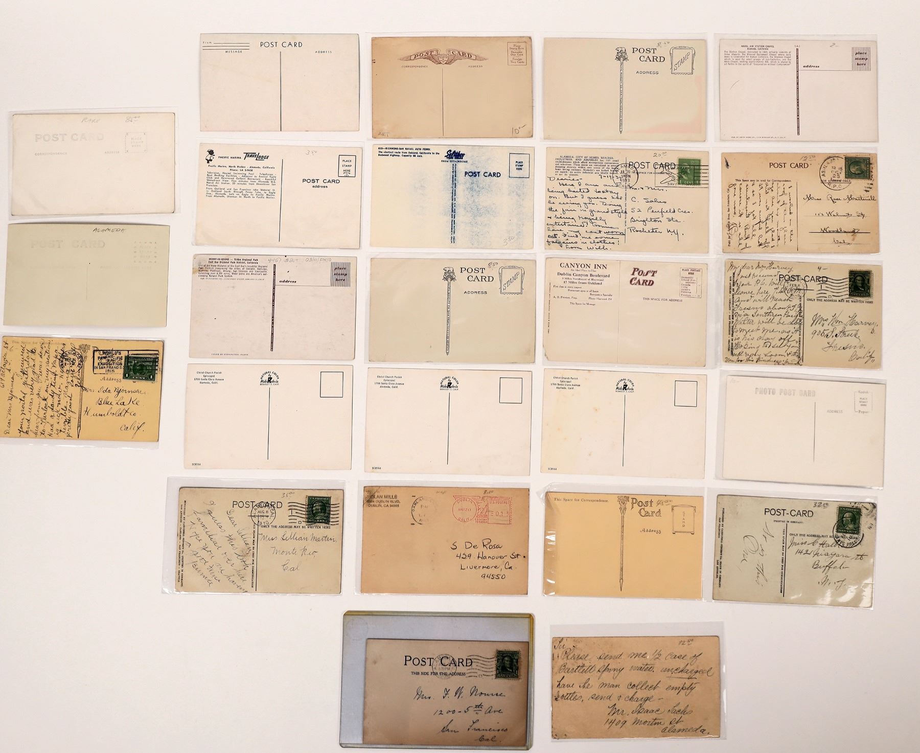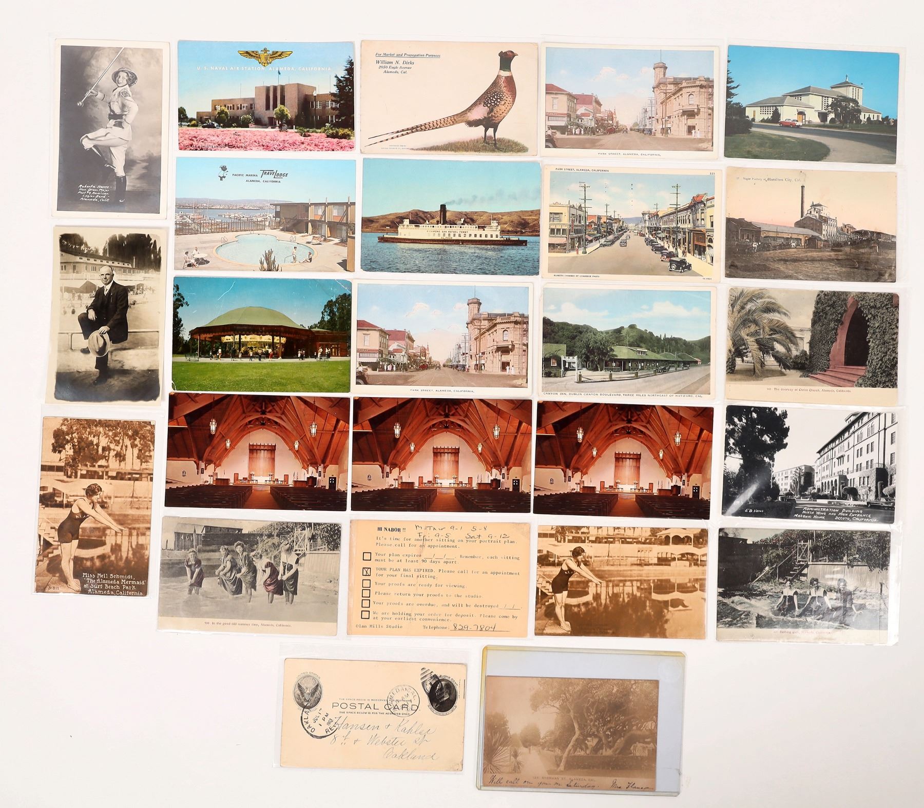 Lot of 26. Three RPC's. three pre-split (one imprinted US Seal and McKinley 1cent) and one photo of Park and Santa Clara Ave 1906 damage to bldg. Postmarks: San Fran, 1915 Pan Pacific Expo, Alameda, S.F. Presidio, Oakland. Street level views " Sugar Factory Hamilton City, women bathingPark st. street scene, Nell Schmidt diver, Naval air station, Richmond/San Rafael ferry, Canyon Inn DublinLegion Band Drum Major Roberta Nance, Masonic Home California Alameda County 1908-39 Ken Prag Collection