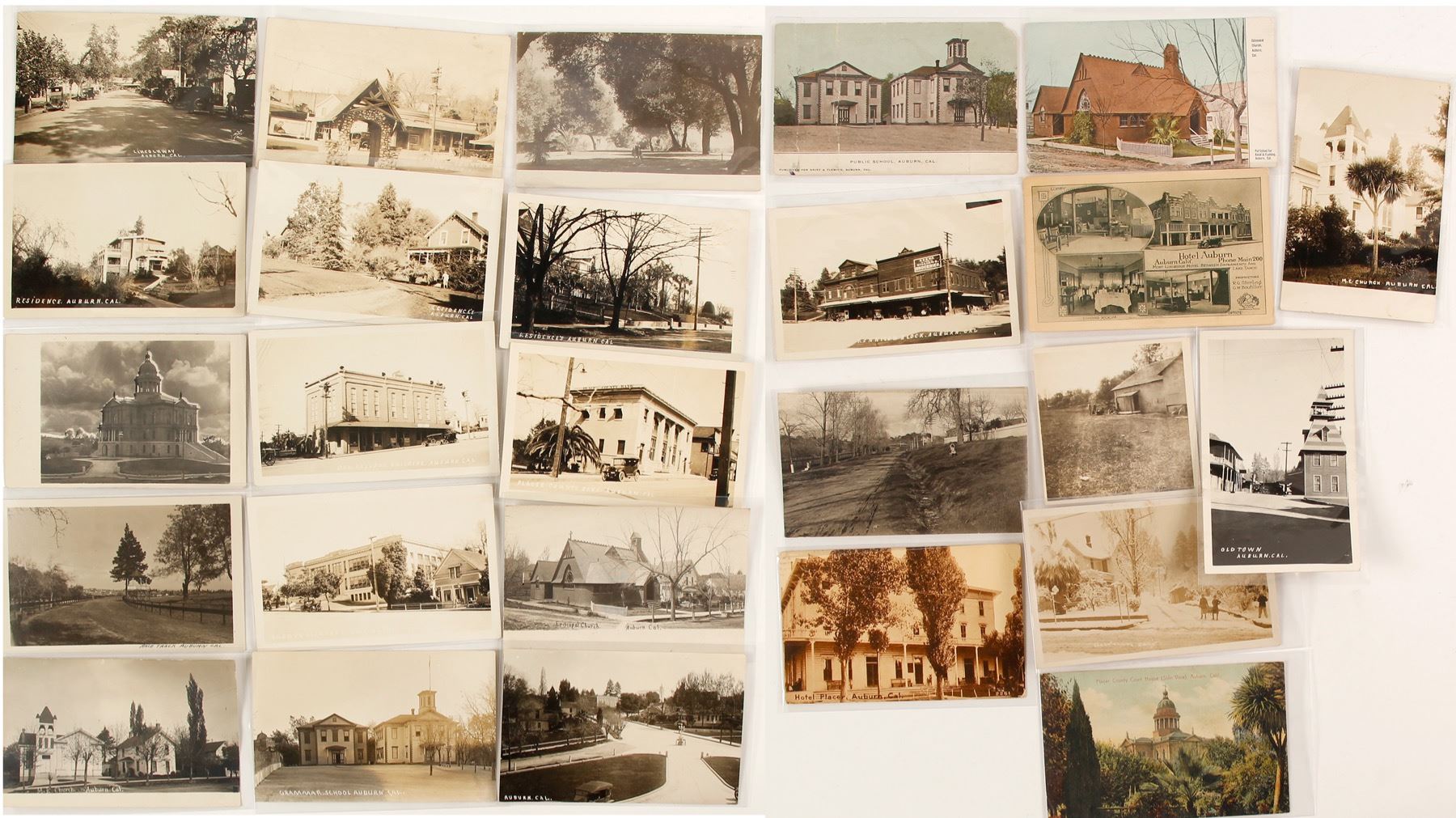 Lot of 26 real photo postcards from Auburn. Early 20th century. Residences, businesses, and the Race Track. State: California City: Auburn Date:
