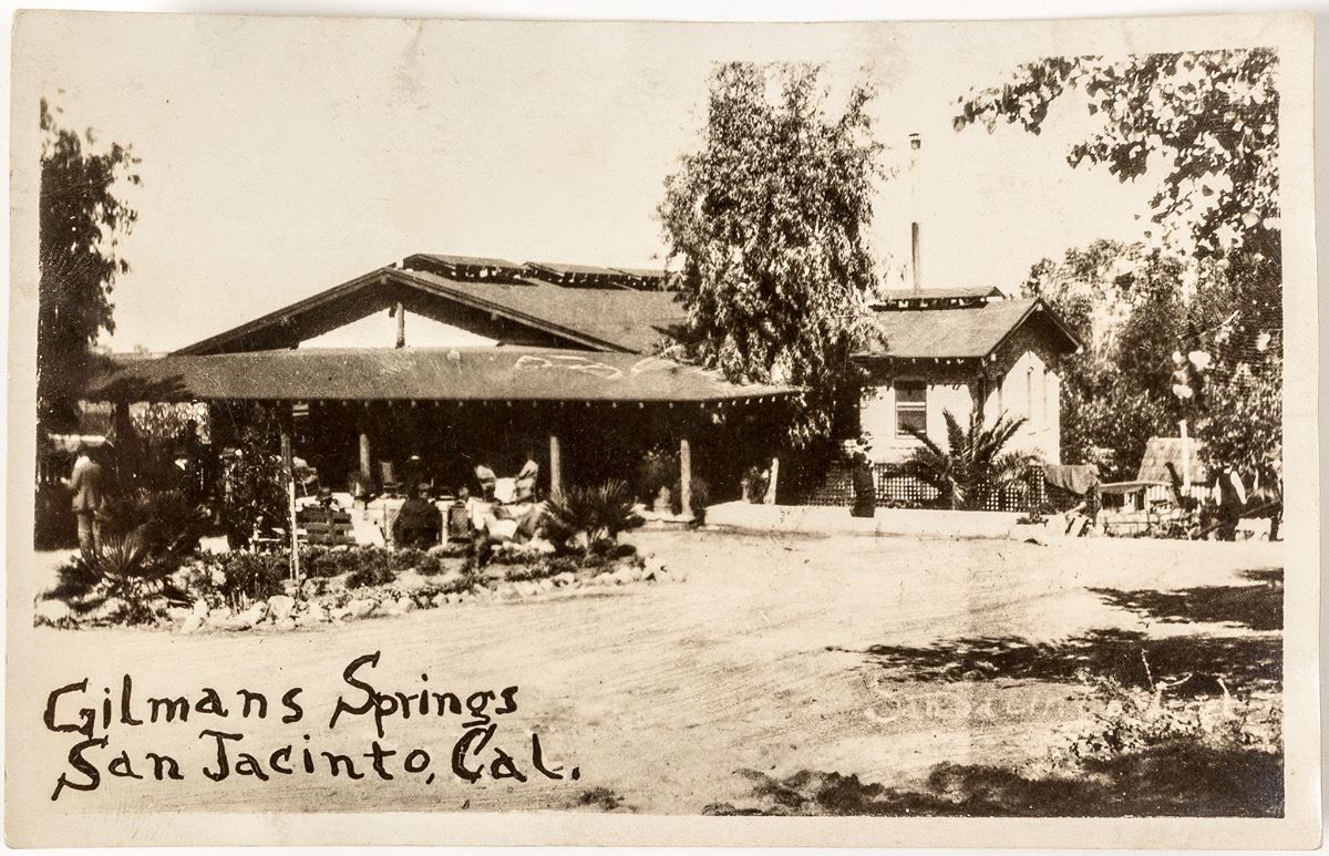 Historic photo of a hacienda named "Gilmans Springs". Sidney James Branch settled the community in 1881 and built the Relief Springs Hotel in 1888. Known originally known as San Jacinto Hot Springs, but was later named after William and Josephine Gilman who purchased the hotel in 1913 and ran the business for 65 years.