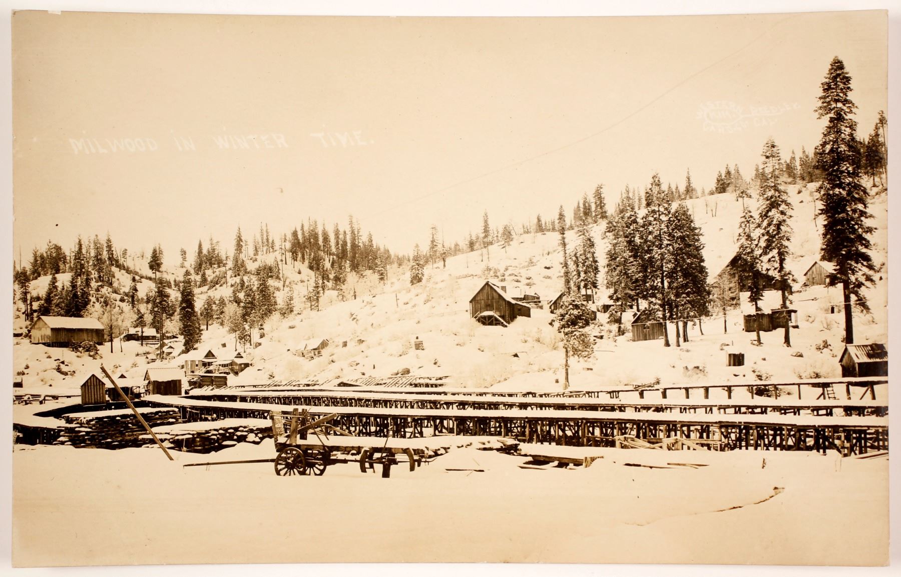 Possibly in the Susanville area as we find mentions of a Red River Lumber company owning a Milwood subdivision. We can also find mentions of a Milwood in Fresno County. Regardless, it is certainly a California lumber operation. The card is by a Reedley, California photographer. "Milwood in Winter Time." Not mailed. c.1904-1918 (based on stamp box).