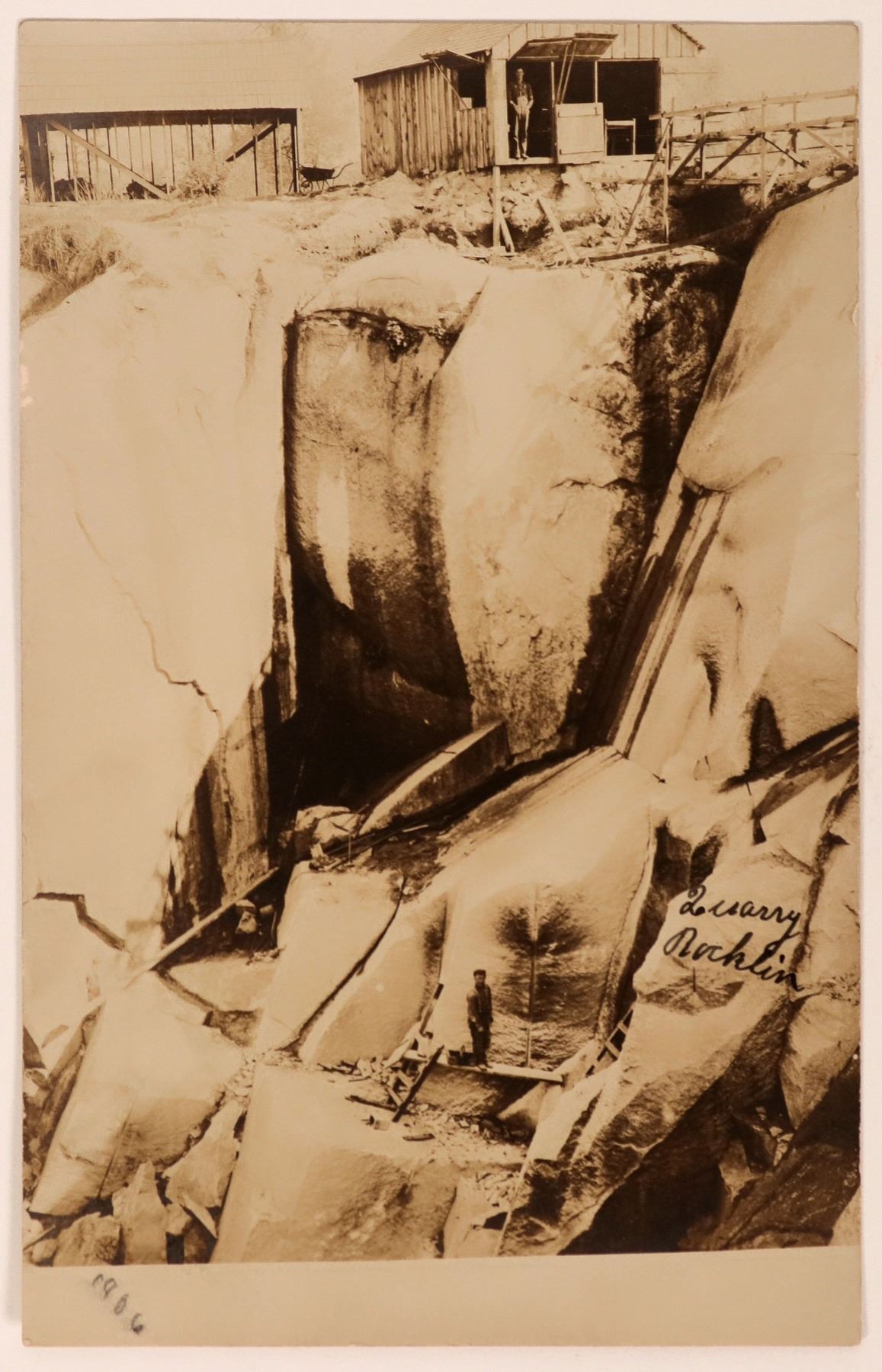 Not mailed. Identified in pen as "Quarry, Rocklin" at bottom right. Two workers visible: one on surface, one in pit. This provides a nice sense of the scale of the operation. Medium contrast. Quarries in Rocklin provided the granite used to build the State Capitol Building.
