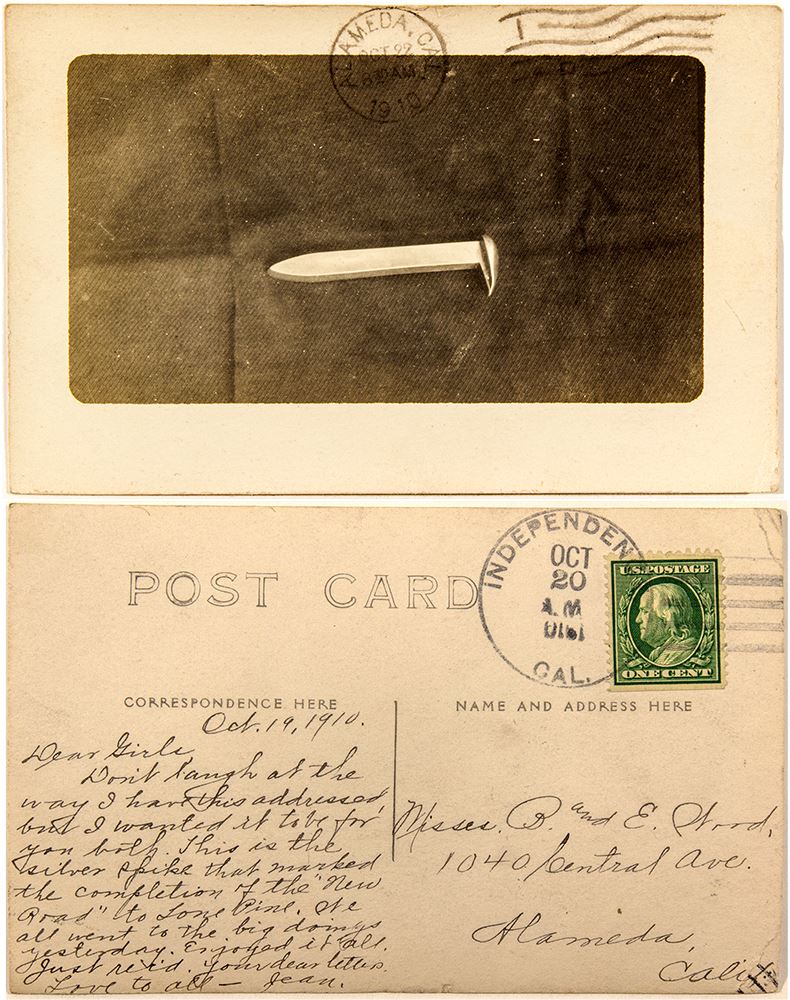 Unique RPC mailed from Independence to Alameda. Message reads: "This is the silver spike that marked the completion of the "New Road" to Lone Pine. We all went to the big doings yesterday. Enjoyed it all." Photo is very clean. At this point, the Carson & Colorado Railroad had been purchased by Southern Pacific.