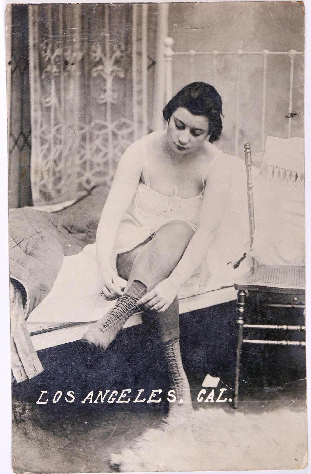 Real Photo postard of a woman tying her boot laces on her bed in a nightshirt. Consignor thinks she's probably a prostitute. Undivided back, circa 1910, unwritten.