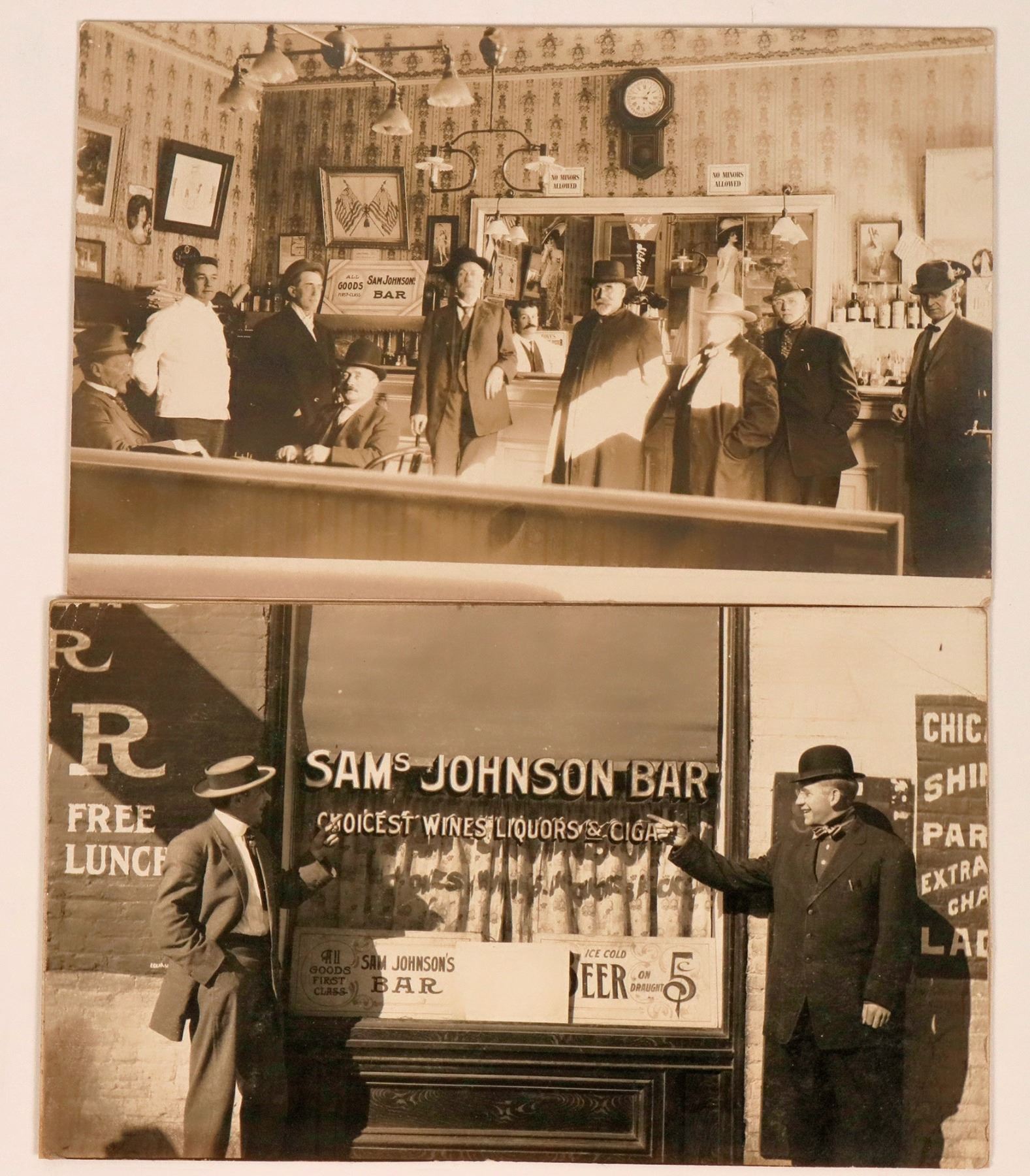 Lot of 2 different, exterior and interior. Very rare. 1) Exterior view of two well-dressed men pointing at the advertising for the bar on the storefront window. Unposted, some toning on reverse. 2) Interior view of saloon with a dozen well-dressed men posing. Pencil notations on the back indicate one of the men is Sam Johnson. Unposted, some toning on the reverse. Sam S. Johnson is known to bottle collectors for his "Sam's Johnson Bar" whiskey flasks. The term "Johnson Bar" has a double meaning. Of course, Johnson is the last name of the proprietor of the saloon/bar. But a "Johnson Bar" is also a railroad term for a lever that the engineer would depress to release steam into the engine. Thus, Holabird believes Johnson used that phrasing on his bottles as a nod to railroad workers. Sam Johnson started in Reno by purchasing a part interest in the Assembly Saloon in 1903. By 1905, he ran his own saloon located at 7 W. Second, possibly a merger with the Assembly Saloon (at 11 W. Second). It operated till at least 1915. [See Volume One of the Nevada Bottle Book]