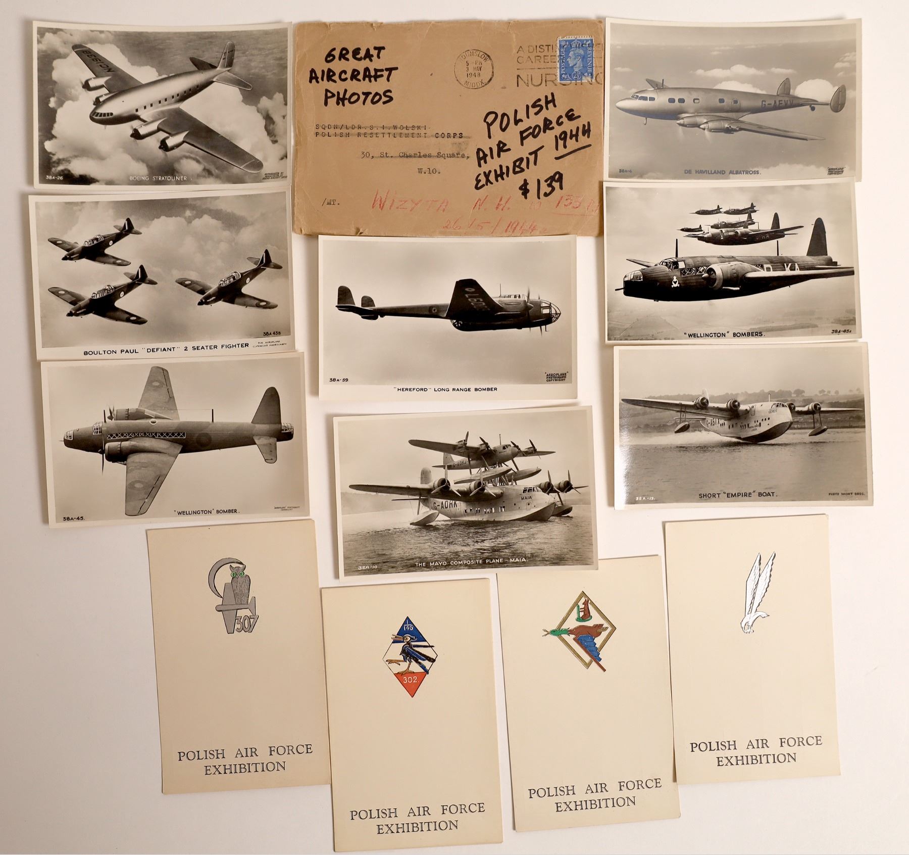 Lot of eight real photo postcards produced by Valentine's & Sons of World War Two aircraft: "Wellington" bomber; short "Empire" boat; Boeing Stratoliner; Boulton Paul "Defiant"; "Hereford" Long Range Bomber; De Havilland Albatross; Mayo Composite Plane. Six cards from the Polish Air Force Exhibition of 1944.
