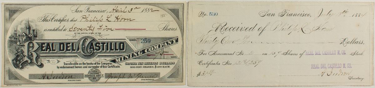 Real del Castillo #259 for 75 shares to Philip Horn in 1882. Signed by A. Indron(?) and Jsoeph McGenes(?). This certificate includes a receipt to Horn from the Real del Castillo signed by Indron for an assessment on the stock he owns. Nice pairing. (Prag collection) City: Baja State: zMexico Date: 1882 hwac# 28752