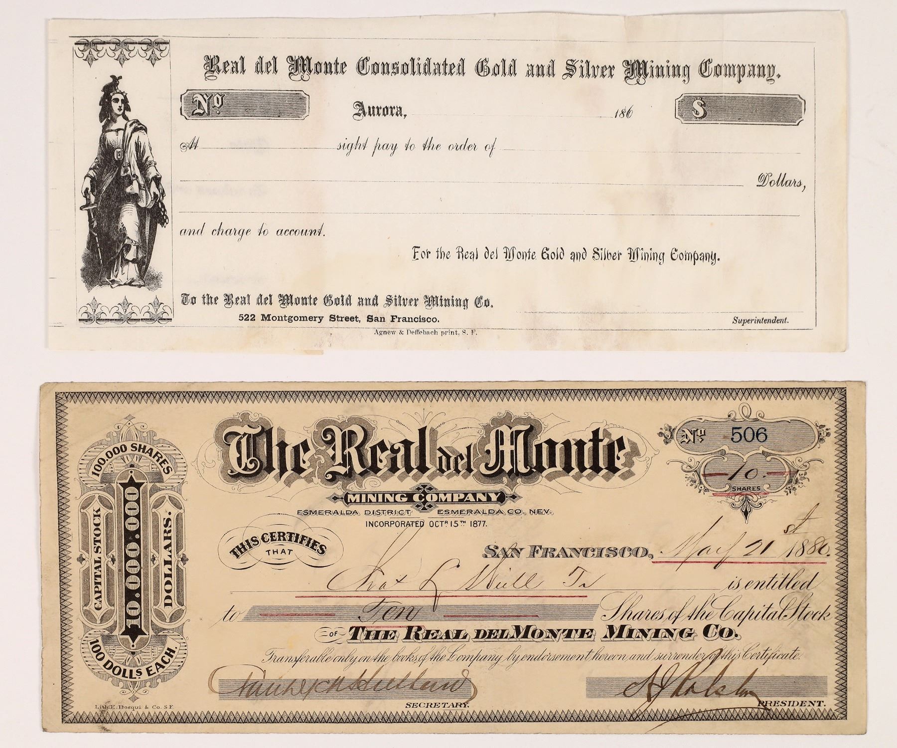 Lot of 2 for this mine named after a famous mine in Mexico. 1) "Esmeralda District, Esmeralda Co., Nev." printed under title. Stock no. 506 issued to Chas. L Weill for 10 shares on May 21st, 1880 in San Francisco. Signed by both the secretary C. V. D. Hubbard and President A. J. Ralston. C. Van Dyck Hubbard was a member of the S. F. Stock and Exchange Board. A. J. Ralston was president of the Selby Smelting and Lead Co. and a nephew of William Ralston of Bank of California/Comstock fame. Black border and print. 4 x 9.25" Pinholes, toning. Re-incorporated on Oct. 15, 1877 (originally June 12, 1862 and capitalized at $260,000; 2600 shares at $100 each). Now capitalized at $10,000,000; 100.000 shares at $100 per. The mine was located in the Esmeralda District in Aurora and formed by combining parts of the Juanita and the Last Chance grounds, both previously patented, forming a property 1000 feet long. By 1881 a shaft had been sunk over 800 feet with drifts running towards the Prospectus mine, but much difficulty was encountered with large water flows causing work stoppages. Assays of a six-foot body of ore encountered in digging the shaft were high. (Ref.: Burchard, Production of Gold and Silver for 1881, p.124; also see Pacific Coast Annual Mining Review and Stock Ledger, 1878, p. 234; Langley's S.F. Directory for 1879-80 and King's History of the San Francisco Stock and Exchange Board). 2) Unused 1860s draft for the company. Dateline Aurora. Allegorical vignette. 4 x 9"