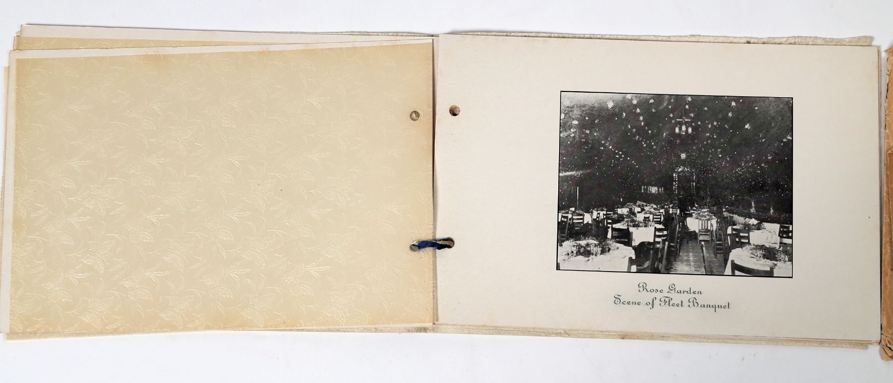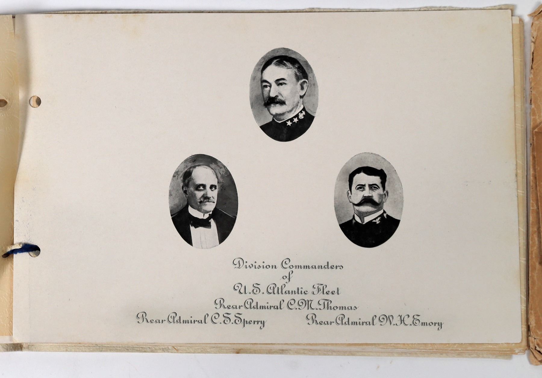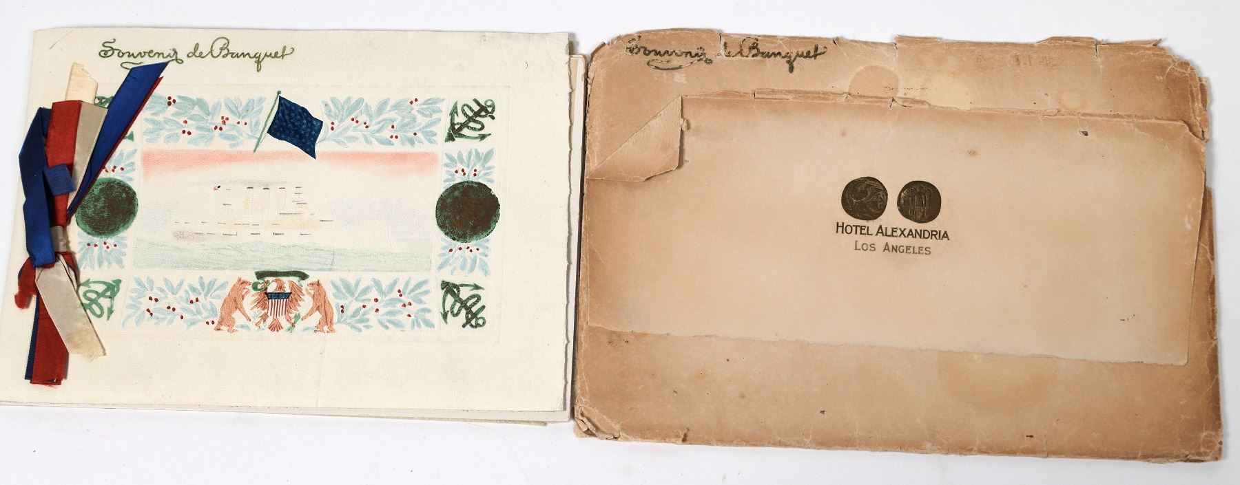 Nice 1908 colored leather cover on this banquet souvenir to Rear Admiral Evans and his officers. Thick pages with photos of officers, mayor of Los Angeles and other notables. Original envelope.