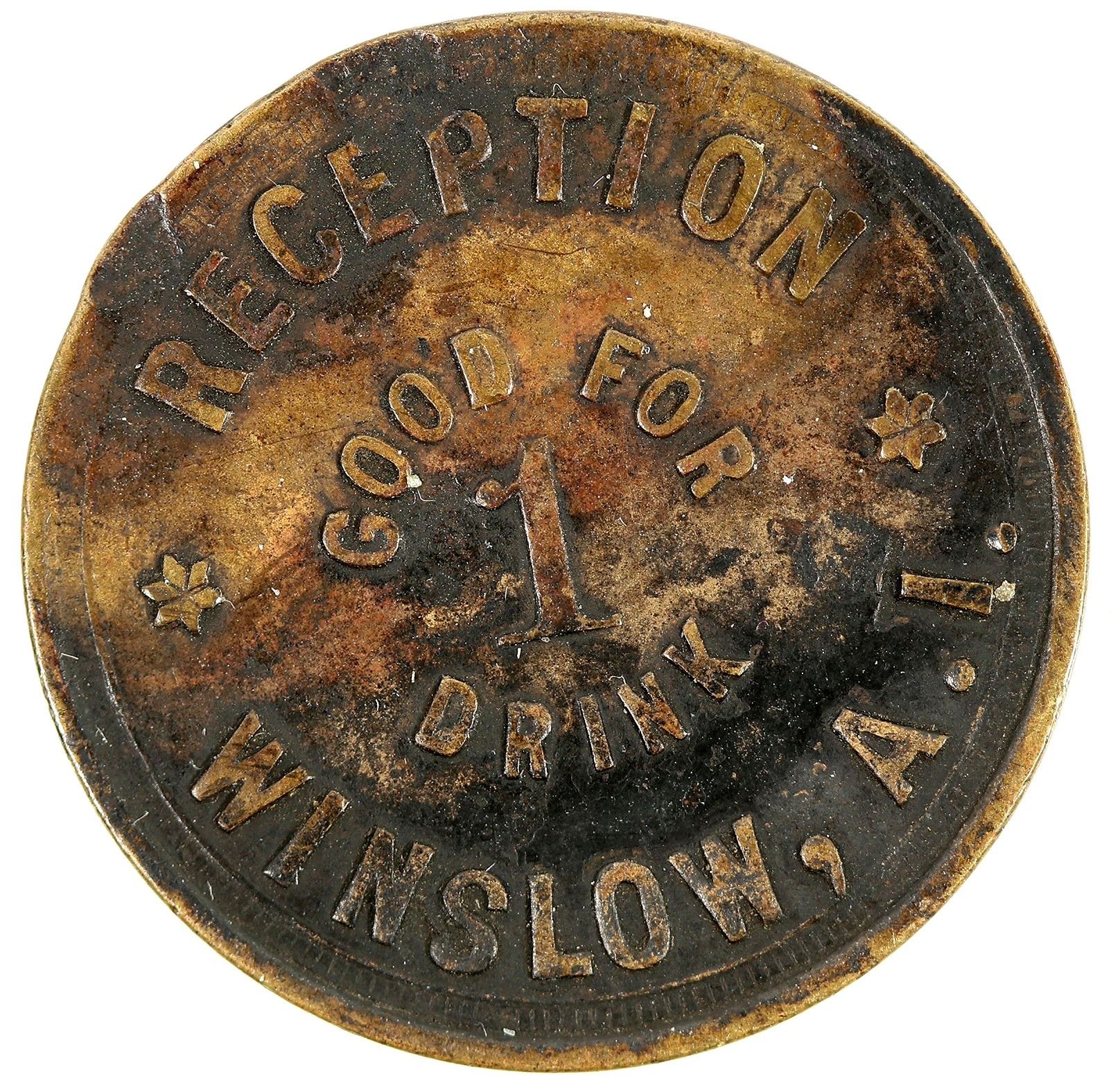RECEPTION / GOOD FOR / 1 / DRINK / WINSLOW, A.T. // G.P.; Br. rd., 24 mm. (Gregory Page, 1887-1891)
