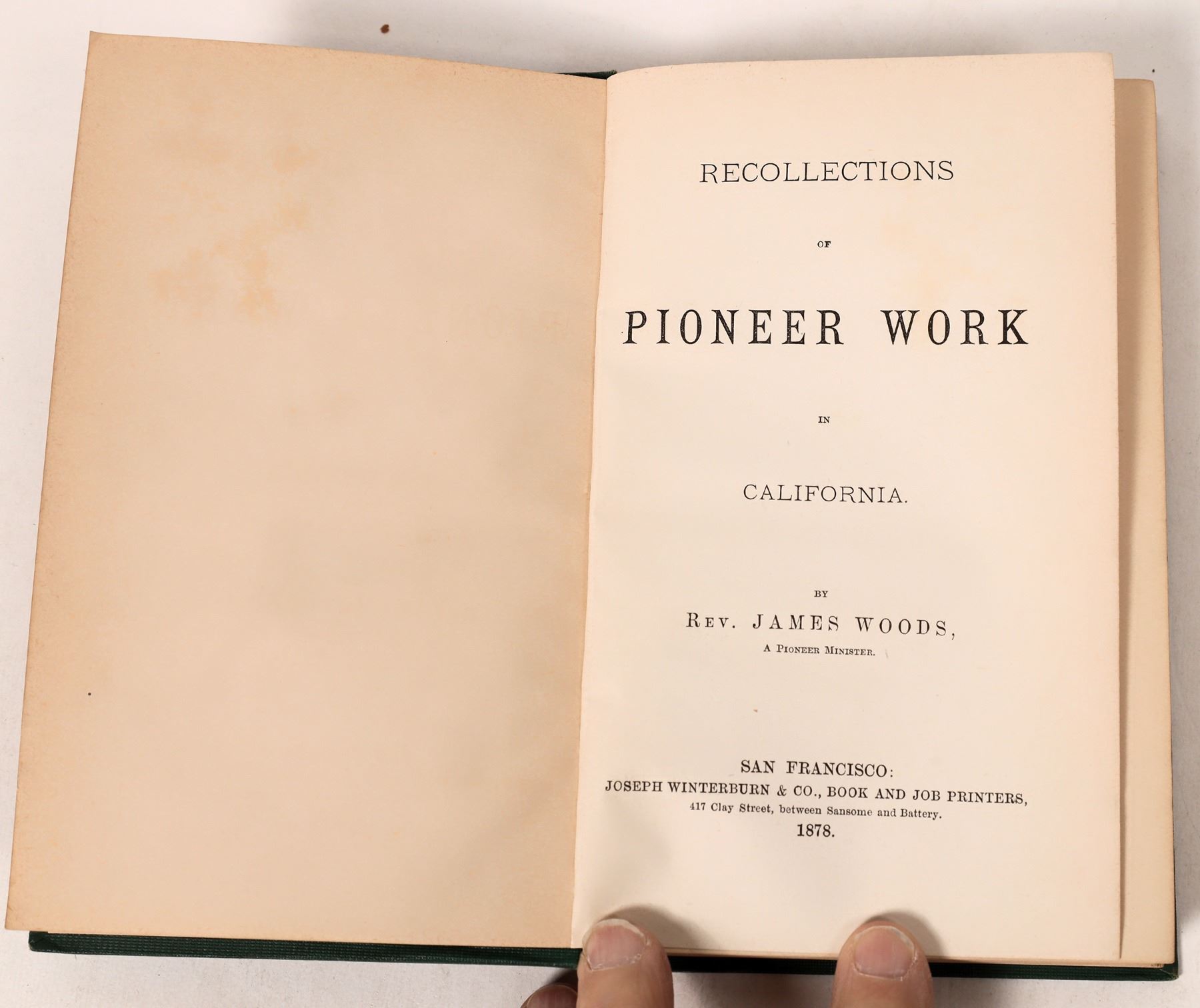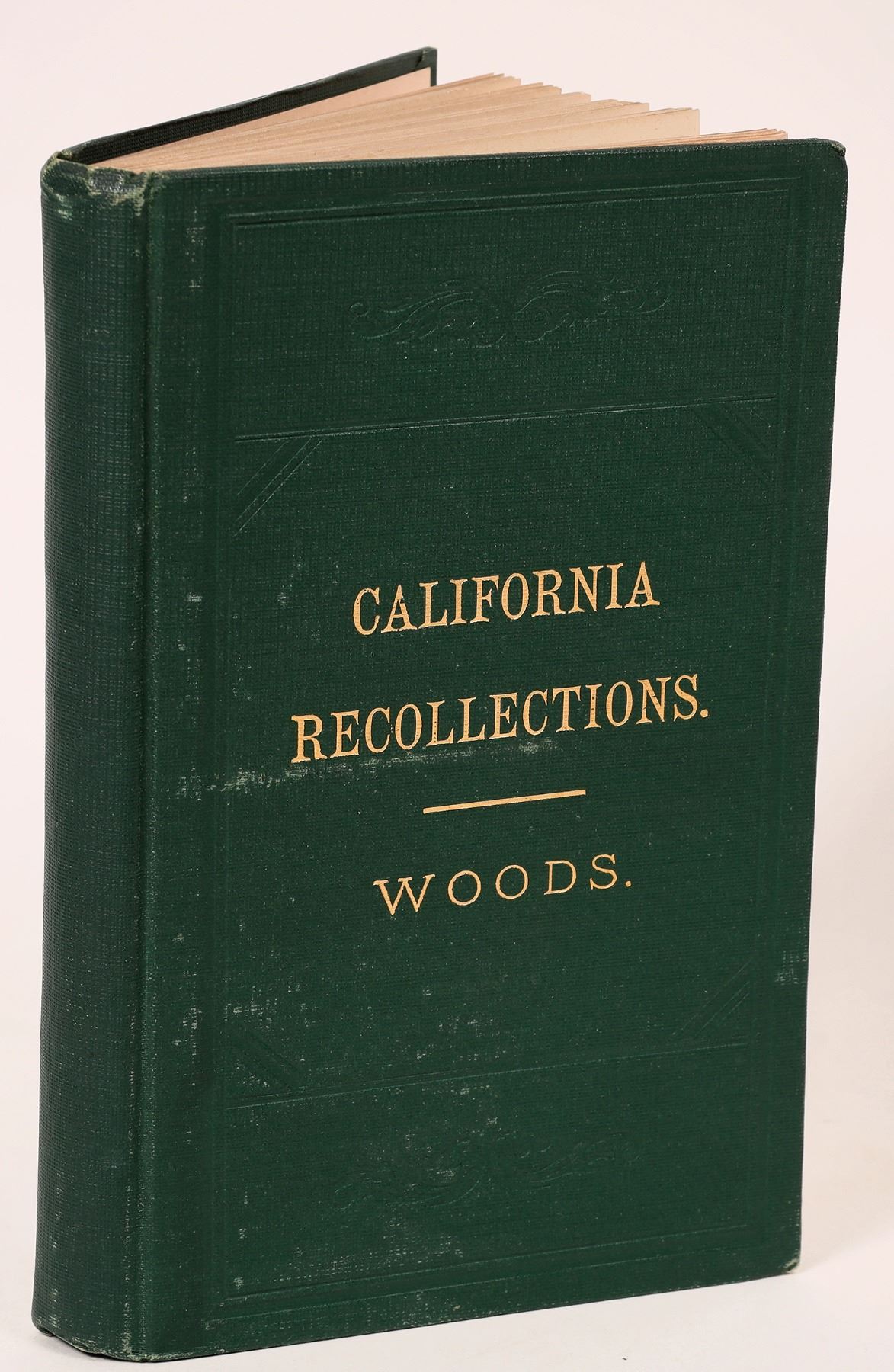 Recollections of Pioneer Work in California: By James Woods. Published San Francisco, Joseph Winterburn 1878, 260 pp. 7.5x4.5, original gilt-lettered green cloth. First Edition. James Woods, a Presbyterian minister, traveled with his wife around Cape Horn to San Francisco in the summer of 1849, and shortly thereafter removed to Stockton, where he established a church for that community. Kurutz notes that "his recollections are much more than an ecclesiastical history, as they give an articulate and human picture of life in that gateway to the Southern Mines...." Cowan p.694; [Gary F. Kurutz]. [Cowan (I), p. 253, (II), p. 694; Howell 50:941; Kurutz 697; Rocq 17257]. Original blind-stamped green cloth, with gold-stamped front cover. Tiny and light spotting to cloth, spine ends and corners a bit bumped, still a near fine copy.