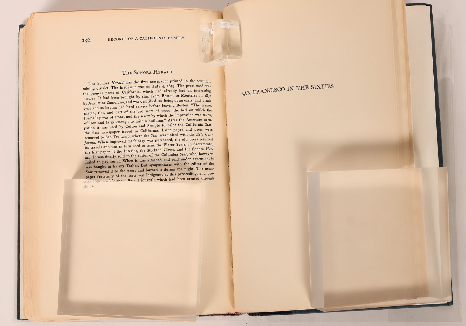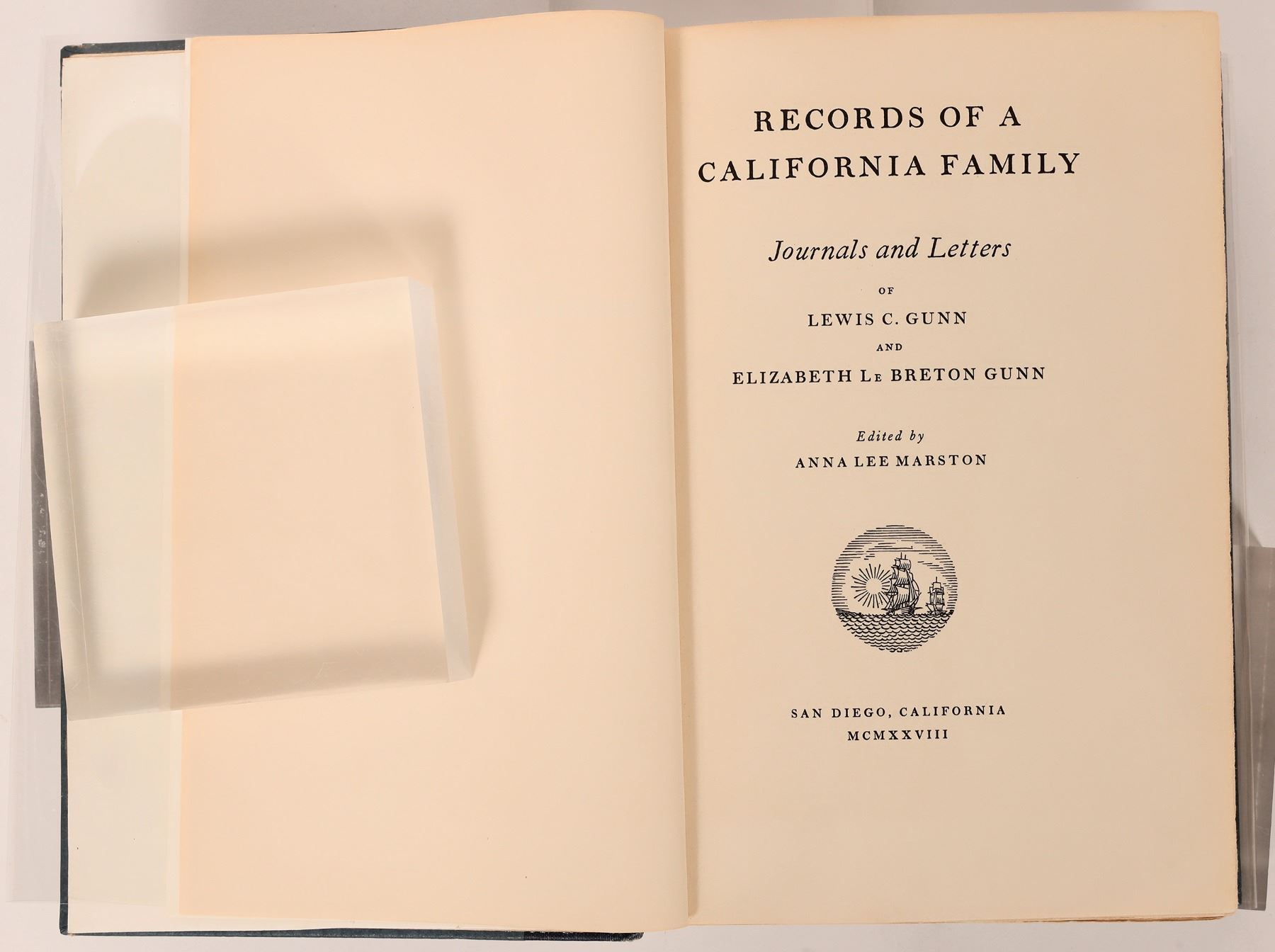 1928 Records of a California Family by Anna Lee Marston. Journals and Letters of Lewis C Gunn and Elizabeth Le Breton Gunn. 279pp, rebound. "Lewis Carstairs Gunn (1813-1892) and Elizabeth LeBreton Stickney (1811-1906) made their home in Philadelphia after their marriage in 1839, and Lewis left for California in 1849, with his wife and four children joining him two years later. Records of a California family (1928) begins with Lewis Gunn's journal describing his journey from New Orleans to Mexico and then to San Francisco and his life as a miner on the San Joaquin& #789;, 1849-1850. Mrs. Gunn's letters chronicle her voyage round the Horn with four children in 1851 and their life in Sonora (1851-1861), where her husband published the Sonora Herald and owned a drugstore. She records the affairs of a family (housework, schools, medical care), newspaper publishing, and politics. The Gunns were longtime abolitionists, and Lewis's role in keeping California a free state is detailed. In 1861 the family moved to San Francisco, and the book closes with chapters by Anna Marston summarizing their life there in the 1860s and their later experiences in San Diego." from googlebooks. Binding has wear on spine top and bottom and corners.