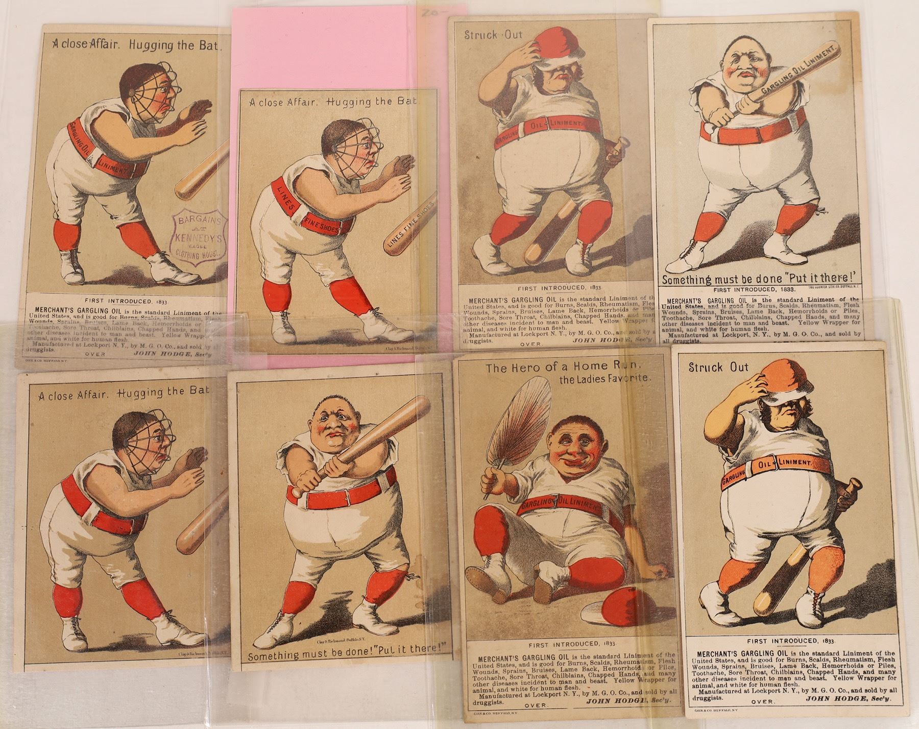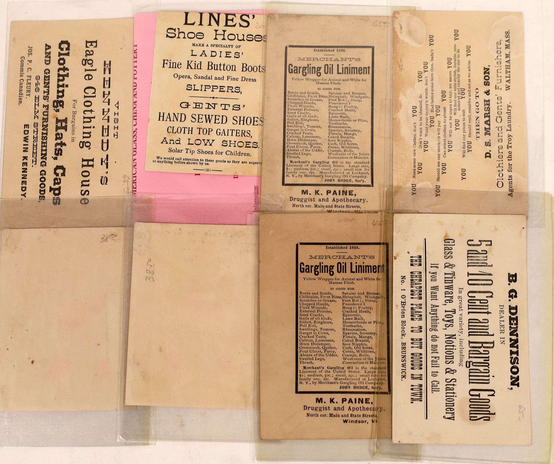 Novelty advertising cards from The Red Belt collection. These were humorous cards that drew readers to the front with silly illustrations which had stores and other businesses on the reverse. There are six different themes and one duplicate. Please see photos for more detail and condition.