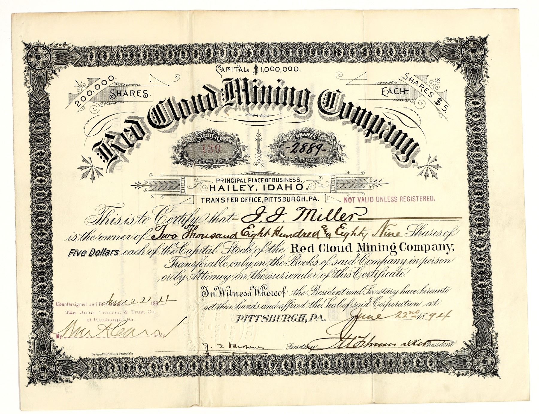 "Principal Place of Business, Hailey, Idaho" (printed under title). No. 139, issued for 2889 shares to JJ Miller in Pittsburgh in 1894. Signed by president Schoonmaker and the secretary. Not cancelled. Pinholes, deep folds, 9 x 11.5" The Red Cloud Mine is known for its world-class Wulfenite specimens and is located in Hailey, Idaho. The mine was established in 1877.