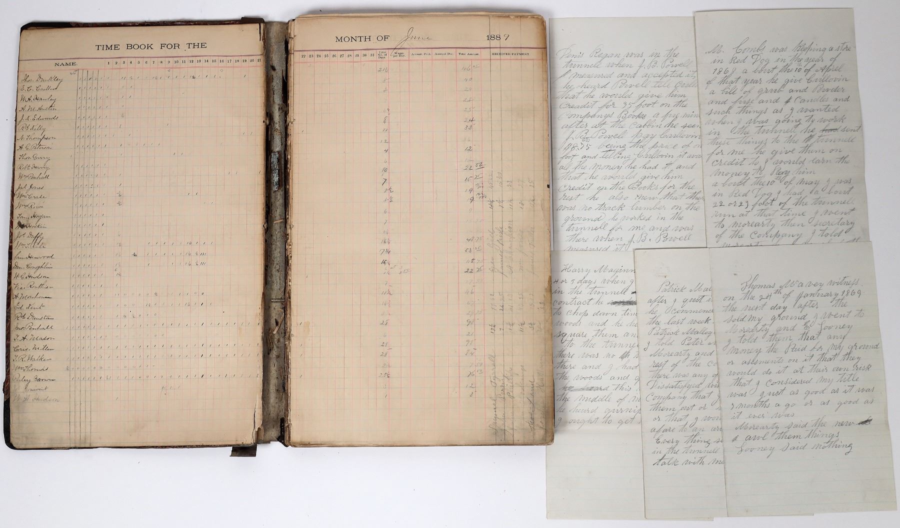 Ledger and letter from Red Dog, a California gold rush mining town in Nevada County. The ledger is a time book from Red Dog Mine showing a list of miners and their wages from 1891 to 1894. It is 8 x 13.25 inches. Damaged binding. The letter names several different individuals and what they were doing in Red Dog around 1868. Includes the original pages and copies. Original is 5 x 8 inches, good condition. Nevada County California