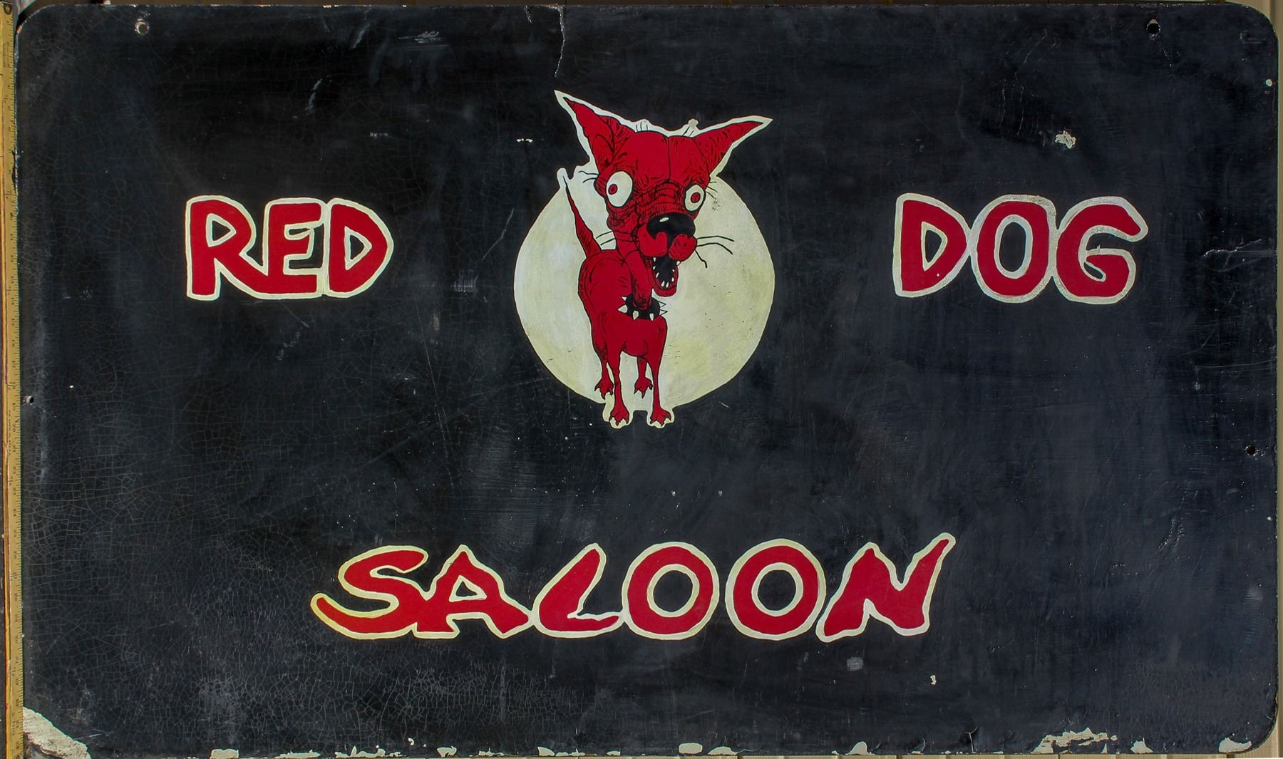 The original Red Dog Saloon sign that hung above the boardwalk near the entry door to the Red Dog Saloon. Possibly original to 1965, but memories of the participants are "hazy." This is a wonderful two-sided sign with the red dog against a black background. 36 x 60." Provenance: Pierce Powell Collection.