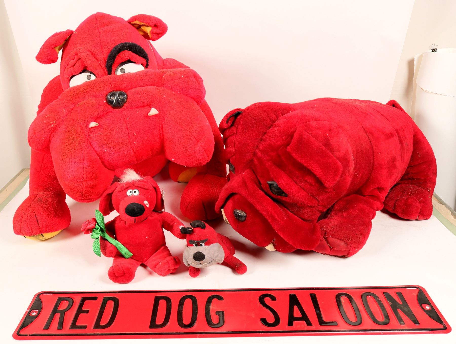 Modern Red Dog Saloon tin sign, Approximately 4" x 36" Black on Red. Two large stuffed Red Dogs about 3' each, somewhat dirty, which hung in the saloon . The lot includes about 24 liquor bottles from when the saloon was "repossessed" about 1998, when everything was removed. Also includes some of the bar glassware, dozen or so insulators that adorned the walls. Sold as "antique" value, for display purposes only. Provenance: Pierce Powell Collection.