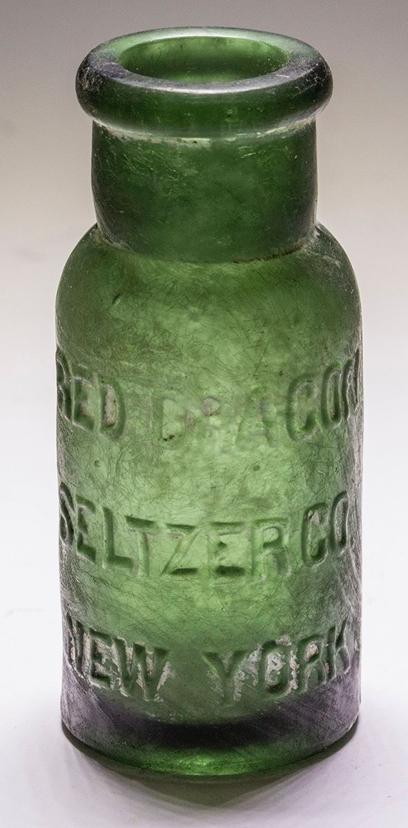 Red Dragon Seltzer Company, New York. 2 inches high, 1 inch diameter, resembles a Bromo seltzer, but this bottle in emerald green. Stained, rare, circa 1890. Date: Location: New York HWAC# 48319