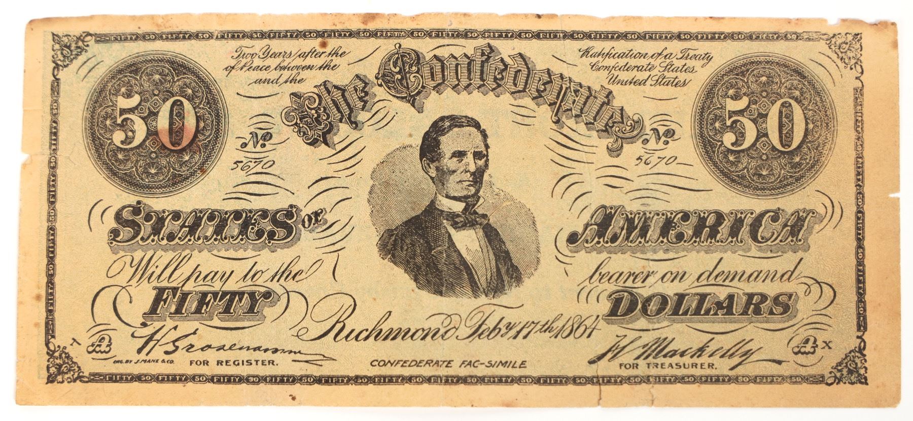 Extremely rare; possibly unique. Compliments of Red Front Saloon & Bar, Karl J. Hutter, Prop., Manhattan, Nevada (Adjacent to Nye & Ormsby County Bank". Reverse is facsimile 50 dollar Confederate note. Toning, tape repair, rips along edge. 3.25 x 7.25" The saloon opened in 1905.