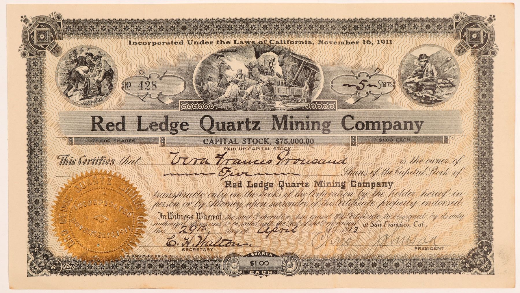 Extra rare! Located at Scott's Flat on Kanaka Creek, Nevada County, California. FH says this was a very famous native gold specimen mine. Inc. in CA, 1911. No. 428, issued for 5 shares to Vera Francis Grousand on April 29th, 1913. Signed by Chris Johnson (president) and Walton (secretary). Three mining vignettes along the top: prospectors, underground workers, and panners. Reverse endorsed. Folds and a few small stains. According to the San Francisco Call (June 23, 1912), "an immense ledge with surface oxidized discloses good values in free gold and a long tunnel has been driven deeper into the vein, where it has shown to be heavily impregnated with sulphurets containing gold." 5.5" x 10" Ken Prag Collection