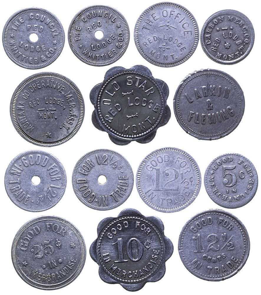 7 Tokens total that are all aluminum and from Red Lodge Montana. 2 R-6's, 3 R-5's, 2 R-4's. The highlights are an R-6 Carbon Merc. Co. / Red Lodge / Mont. // GF / 5c / In Merchandise. Round, Aluminum, 19mm. R-6 The Office / Red Lodge, / Mont. // GF / 12 1/2c / IT. Round, Aluminum, 22mm. R-5 The Council / Red / Lodge / Whitter & Co. // GF 12 1/2c / IT. Round, Aluminum, Punched, 21mm and others. City: Red Lodge State: Montana, Date: Inventory# 40120