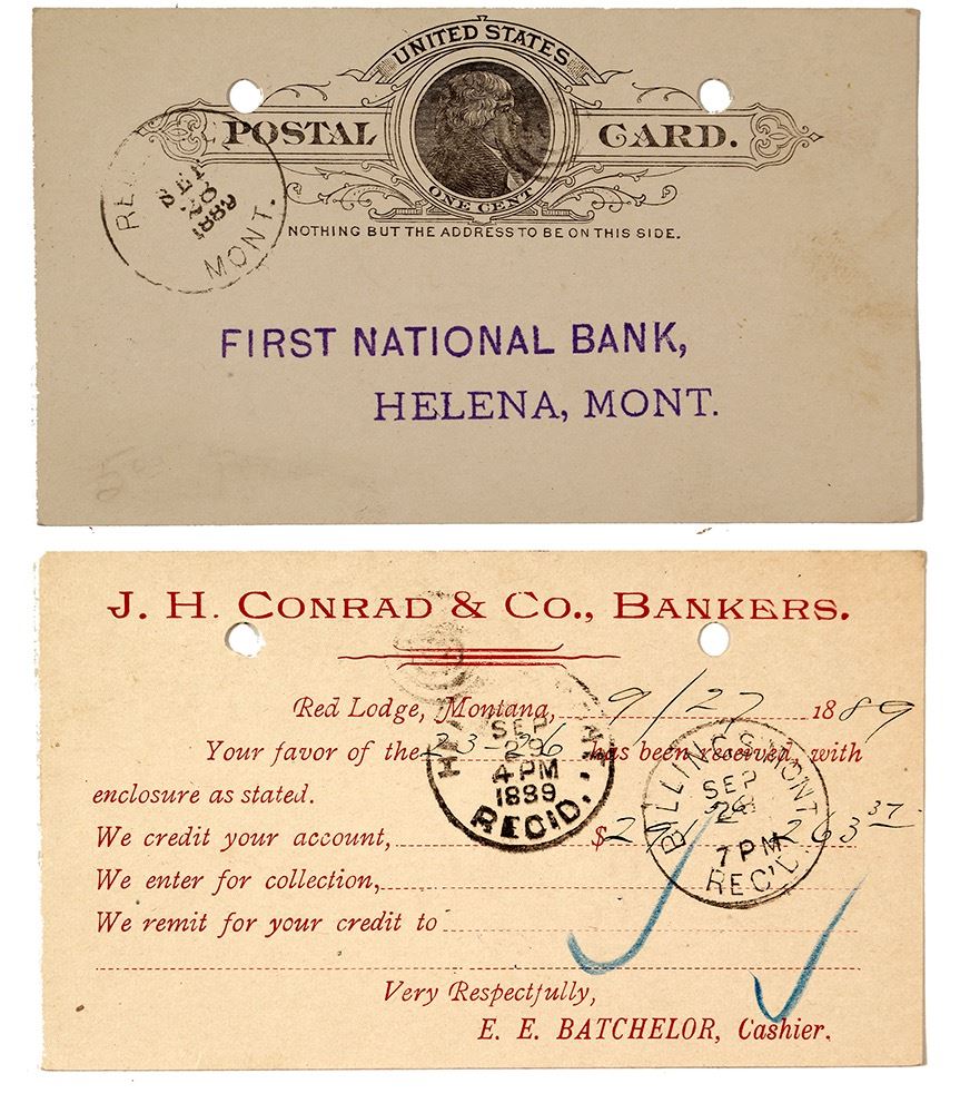 Type 2. Six total listed in the Shellen & Dunn census. Light strike. From J. H. Conrad & Co., Bankers. City: Red Lodge State: Montana Date: 1889 ID: 36763