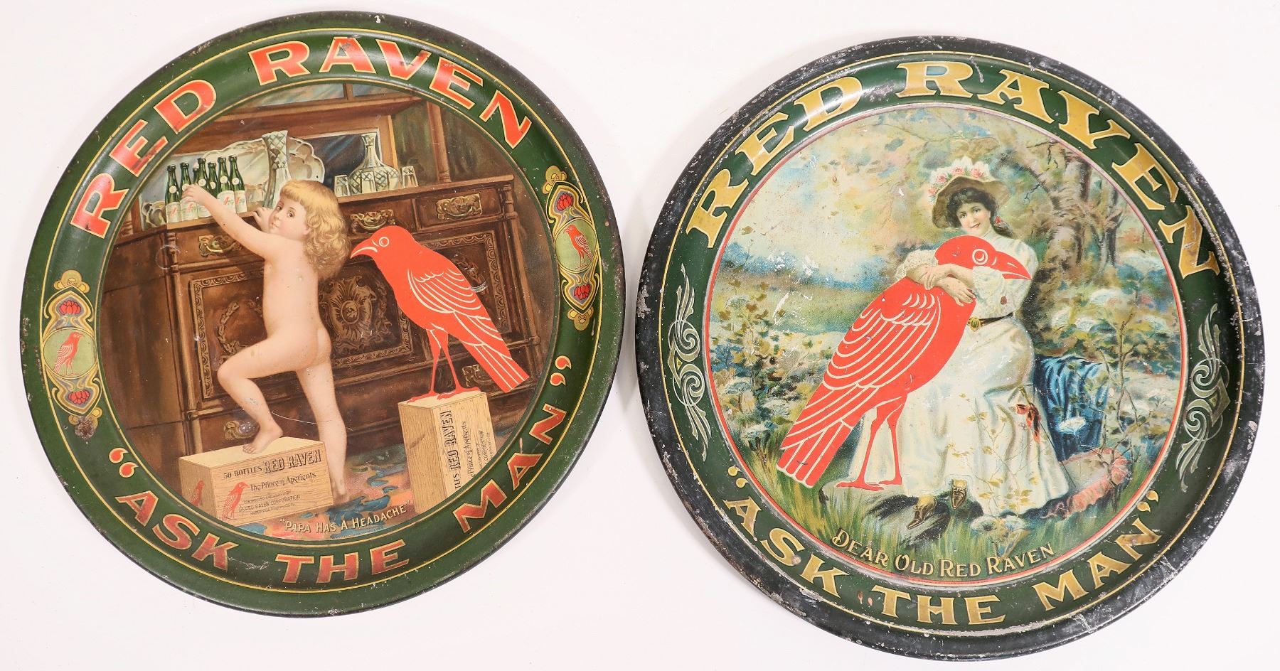There are two trays in this lot from Red Raven. The first tray depicts a young lady with dark hair embracing the red raven, at 12 in. marked "Red Raven/ Dear Old Red Raven/ ask the man". The base has some light oxidation, edge wear, and color loss, fair to good condition. The second tray depicts a little girl reaching to get dad's beer "Papa has a headache", and it has blonde hair and blue eyes. Marked "Red Raven/ ask the man" with the raven standing on the box, 12 in. Oxidation on the edge. In good condition. Pre-pro. Pennsylvania