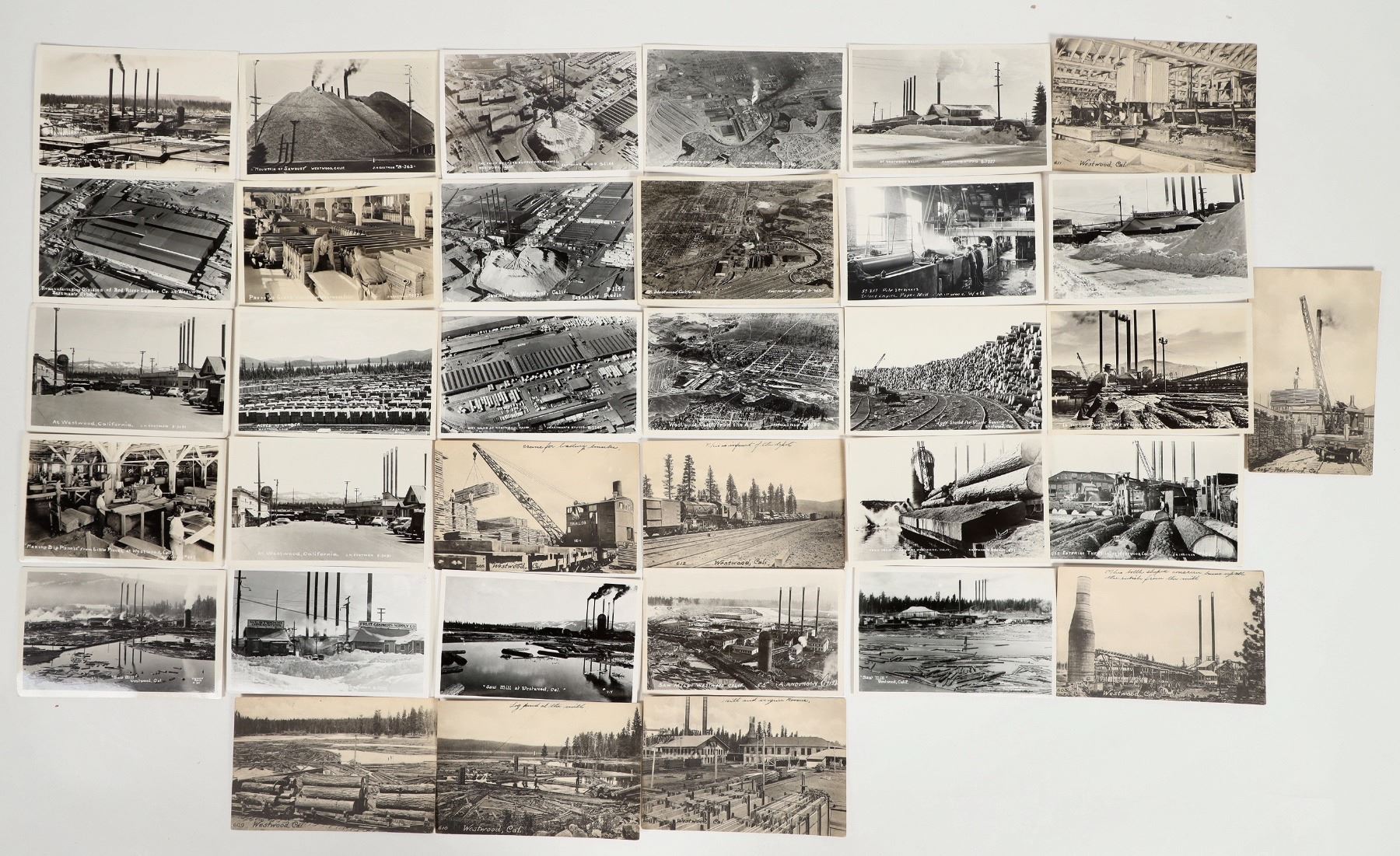 This is a lot of 34 postcards containing 27 real photo postcards and 8 black and white printed postcards. These postcards present an operations center (Red River Lumber Co.) built in 1913 by Thomas Barlow Walker and serviced by the Fernley and Lassen Railway Depot, built from 1912 to 1914. This company was credited with being "the world's largest electrical sawmill of its time," says Sierra Buttes Trail Stewardship. Additionally, the company operated one of the first electric railways in California in 1927. Most of the postcards are undated.