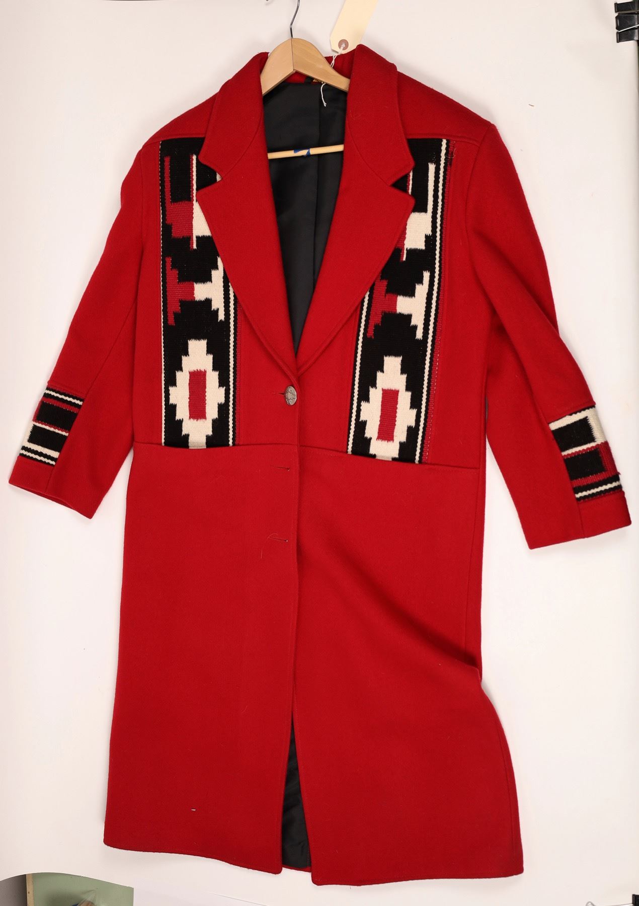 Stunning long red wool coat by Pioneer Wear with Navajo style woven designs in red, black and white. Size small-medium. Excellent condition. If you have cold winters, you need this coat! Very fashionable!