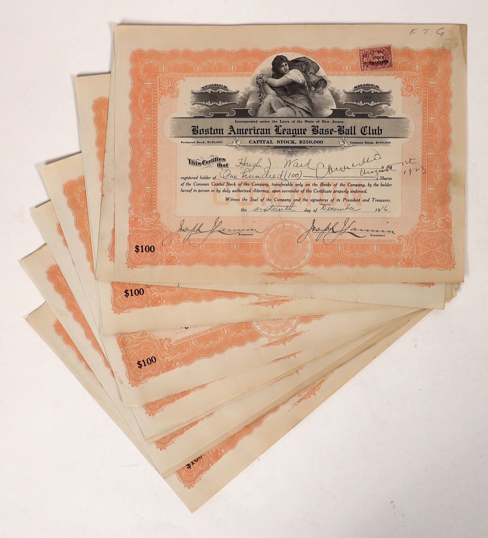 Boston Red Sox stock certificates (10), signed by owner Joseph J. Lannin, the man who brought Babe Ruth to the major leagues in 1914. While eight are self issued to Lannin. two exceptions are issued to theatre actor, dancer and impresario, Hugh J. Ward, one for forty seven shares at $100 per, dated December 16, 1916 and one also dated December 16 for 100 shares. Both of these were transferred to future team owner and the guy who sold Babe Ruth to the Yankees in 1920, Harry Frazee, who also signed the document. Both of these certificates have stock transfer stamps affixed. These are in nice condition and ready to add to your baseball condition.