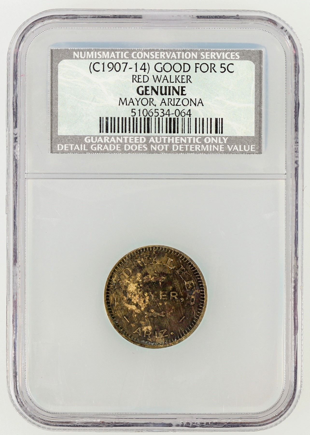 Yavapai County saloon 1907-1914: RED WALKER / MAYER, / ARIZ. // GOOD FOR / 5¢ / IN TRADE; Br., rd., 21 mm. R-3.