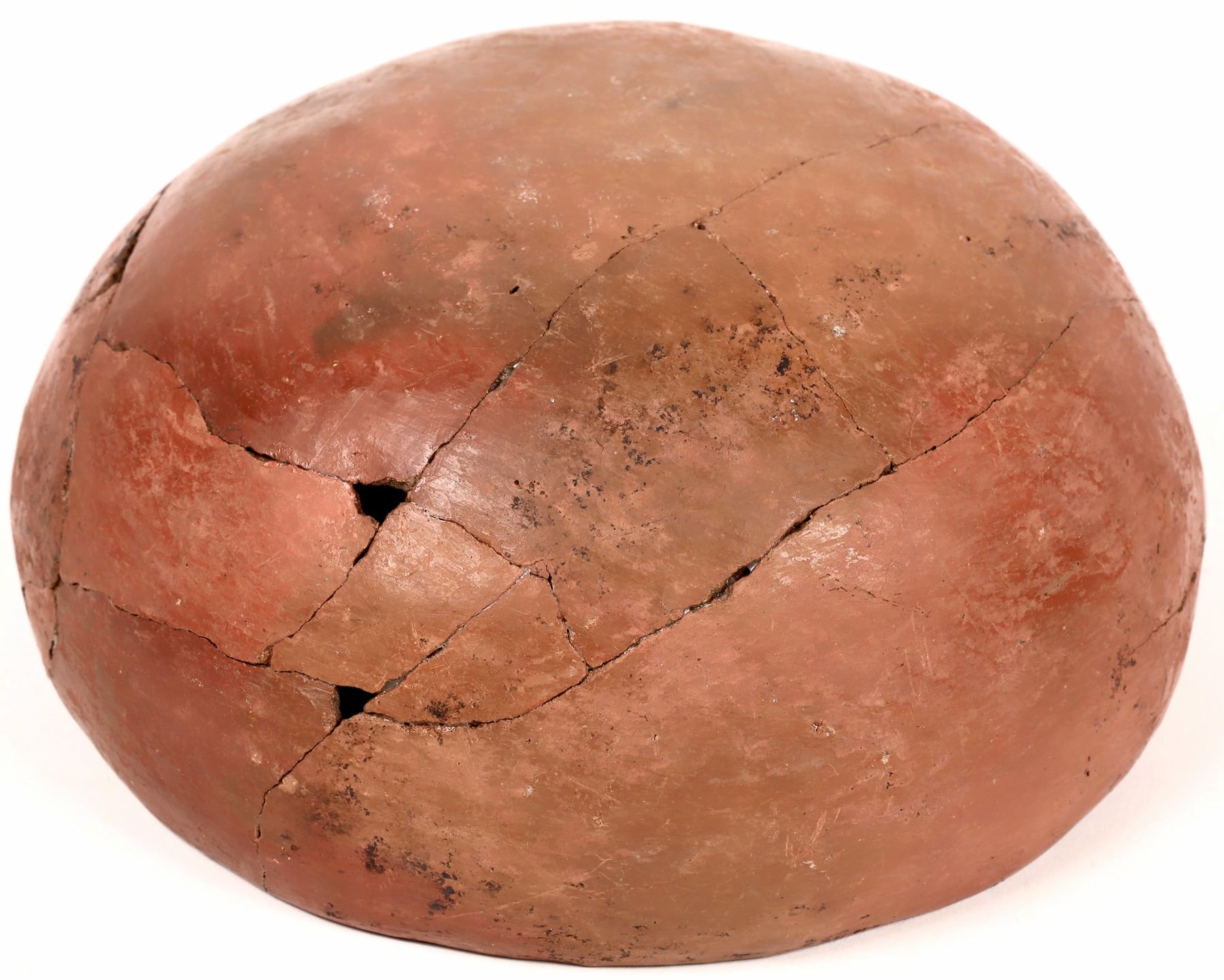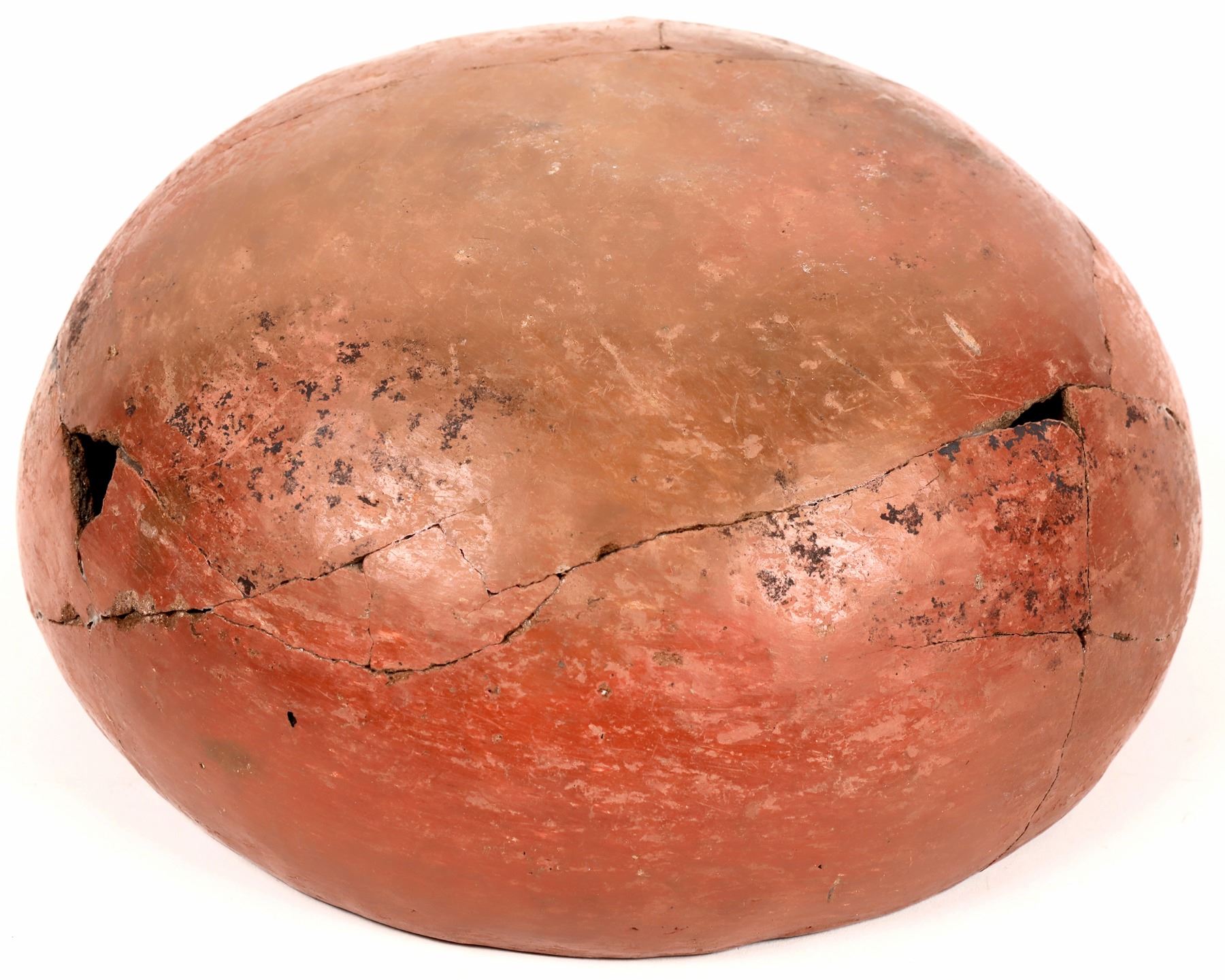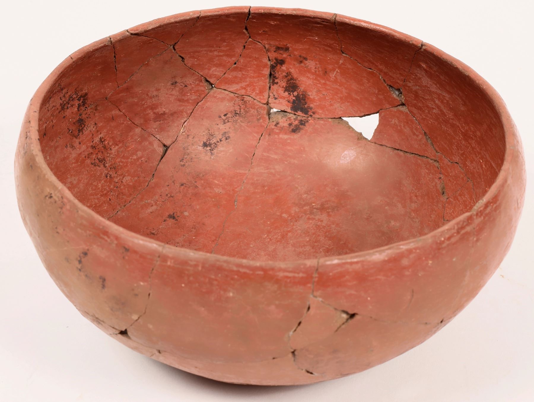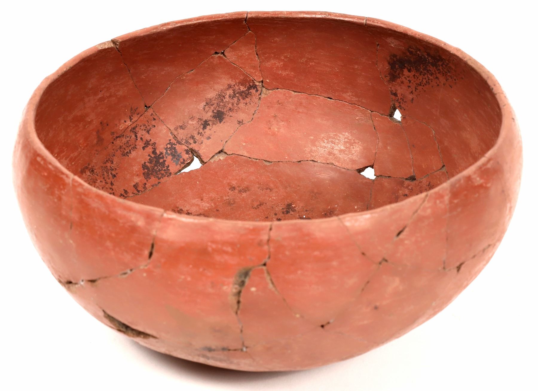 Reconstructed red ware medium bowl. 3.25"x8.5". Missing small shards, lip chip.