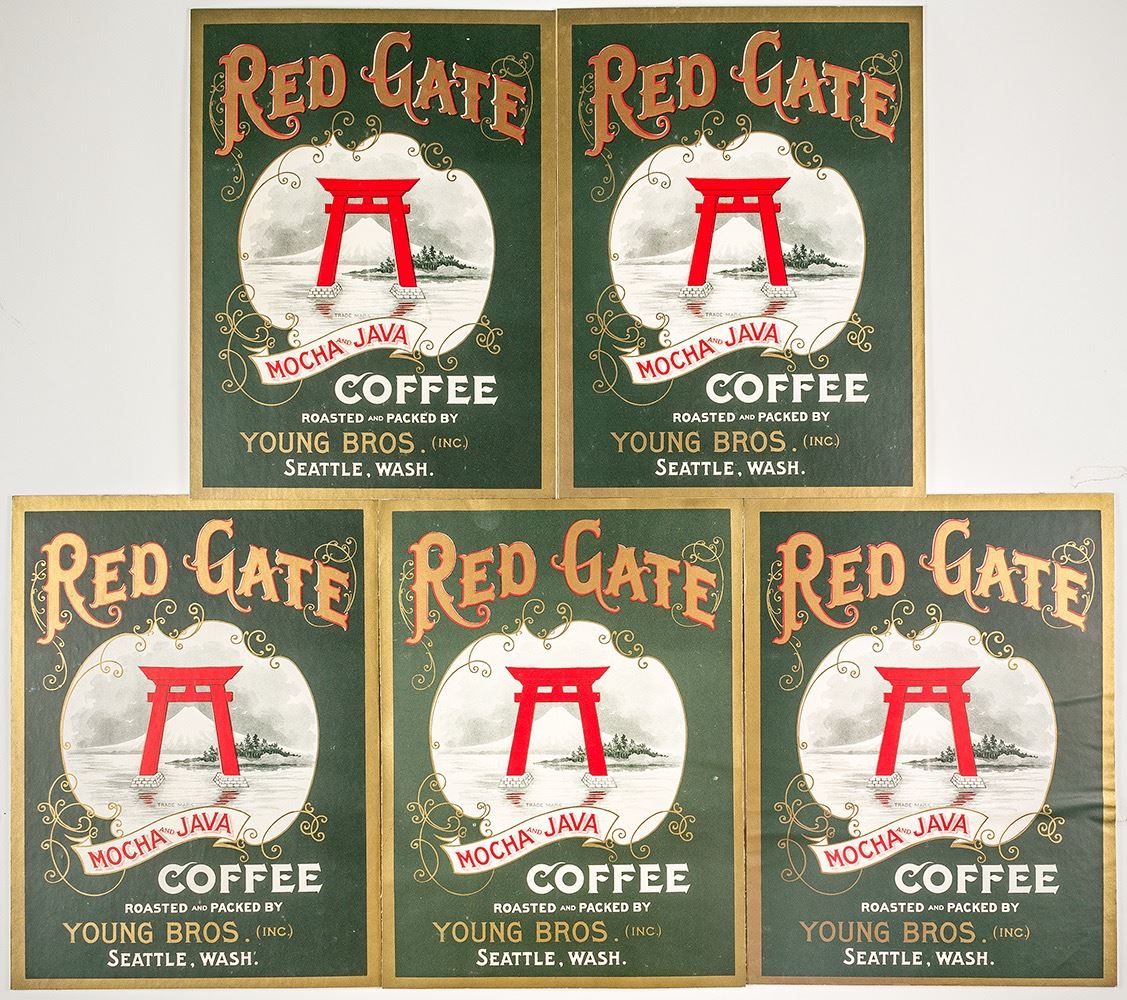 Five beautiful advertising signs for Redgate mocha and Java coffee, roasted and packed by young brothers, Seattle, Washington. Bright vibrant colors, mint. 10.5 x 14". City: State: Date: Inventory# 38902
