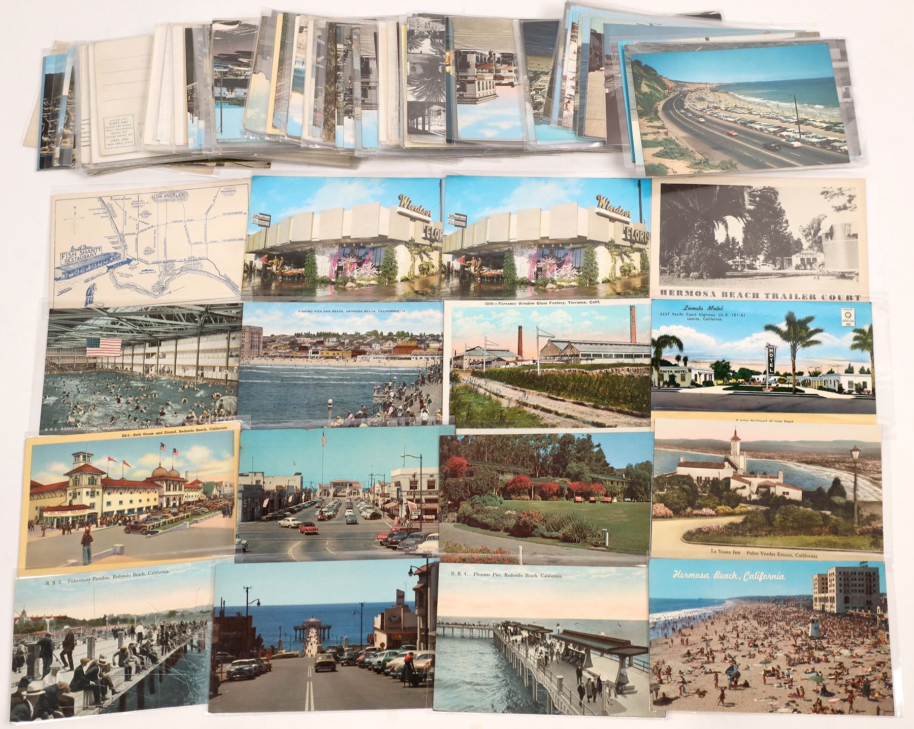 Large collection of over 100 cards. Color, some white borders. Publish Logo”: Torrance “Planned City”, Theo Somber photos, M.Kashower Co., Redondo Beach Camp. Thirty One postmarked 1911-65 : L.A., Redondo, Hermosa, Manhattan Beaches, Hemet, Culver City, San Diego, Ocean Park. Covering Redondo, Manhattan and Hermosa beach’s: Street scenes, beach scenes, motel ad card, recreation piers , restaurants, Alpine Village, Bit of Germany, Birdseye of Redondo Beach, Hermosa and Manhattan Beaches. Example : Bit of Germany w/map to locate. The Warehouse Restaurant (good food and still there), Redondo Bath House., Fisherman’s Wharf, Torrance Calif (cir1950’s). Smith Bros’ Fish Shanty Walteria Cal. W/Mao City: State:California Date:1925-50