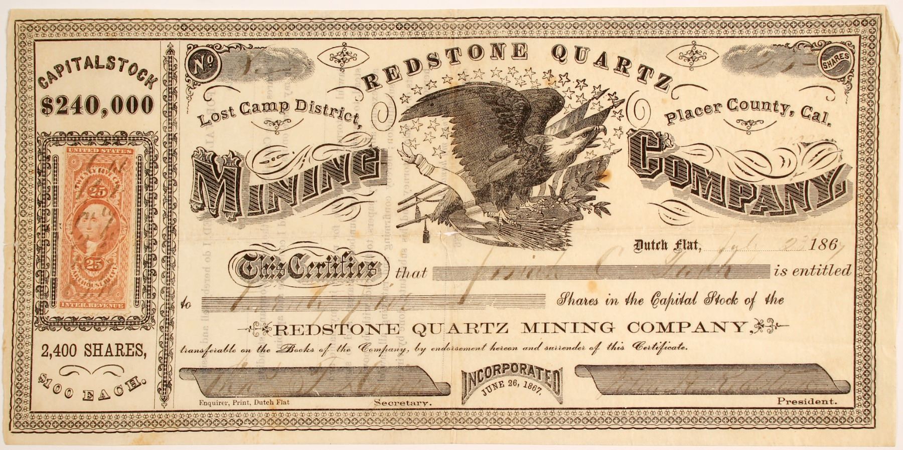 # 8(?) for 25 shares to Josiah C Huch(?). Datelined Dutch Flat 1867. Signed by secretary Charles F (?) and president (?). Incorporated June 26, 1867. Printed by the Enquirer fo Dutch Flat. United States Warehouse Revenue Stamp. "Lost Camp District, Placer County, Cal." Eagle and flag vignette. Some staining. Tears along corners. Hole at the juncture of horizontal and vertical folds. Faded. Good Condition. Not in Filer. Lost Camp was in Central Placer and Nevada counties. It Was in the vicinity of the towns of Emigrant Gap and Blue Canyon. It was both a lode and placer mining area. Although no great production, there was work done here throughout the 1800's and 1900's. [Gold Districts of California by Clark] Prag Collection City: Lost Camp Mining District, Placer County State: California Date: 1867 HWAC# 79232