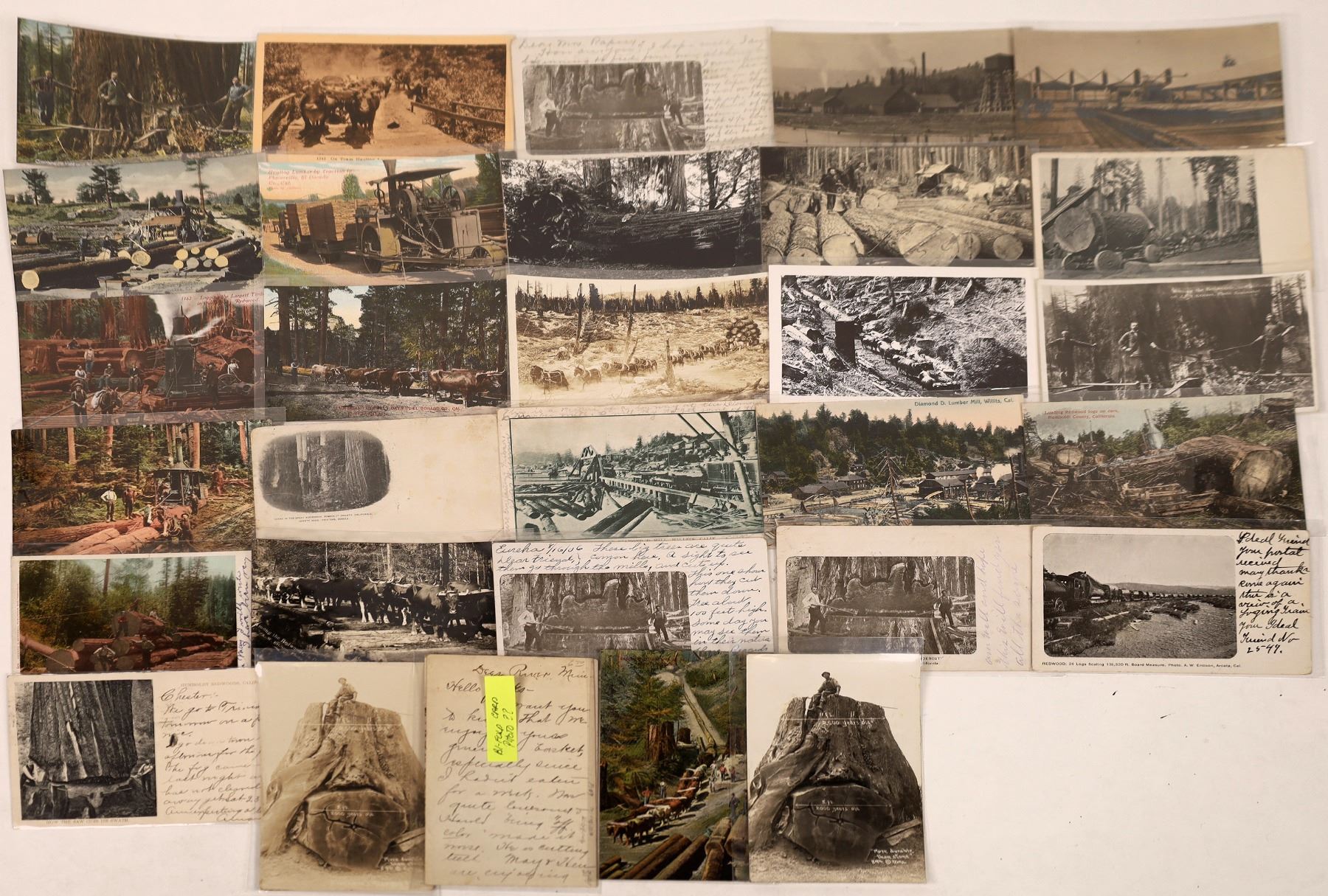 Lot of 30. Fourteen postmarked w/stamps 1905-32. One Bi-fold photo card of horse hauling logs. (1909). Eastman (1895) and Ericsson photo cards. Hauling by horse, oxen and train. Ground views of camps. Mill and equipment Weed, Clipper Mills Butte COunty, Merced, El Dorado County, Camp Meeker and Arcata. Protective sleeves.
