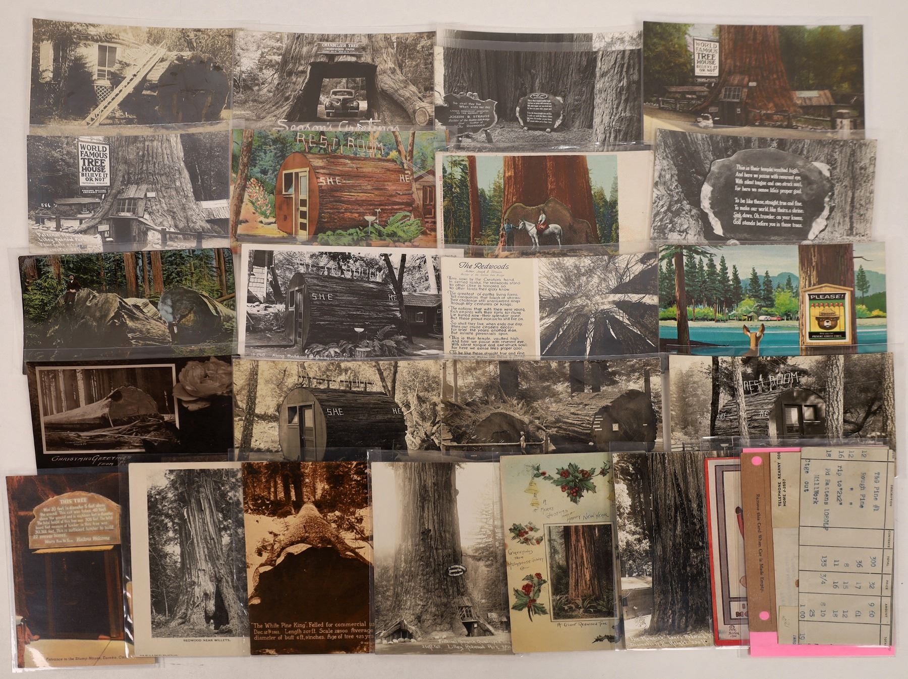 Lot of 26. RPC’s included in lot. Four are postmarked , three w/stamps 1910-41. Greeting cards, World Famous Tree House, bathrooms made from large redwoods, Cathedral Tree at Trees if Mystery, Fraternal Monarch tree. All ground view perspective. Couples f color card. Order toMacdonald Lumber Co. for cut timber, Sept 27, 1911. Albion Lumber CO. Railway rail car content card. #d card “I’t Saw Wood Most of the the TIme” figure of man sawing wood. All in protective sleeves.